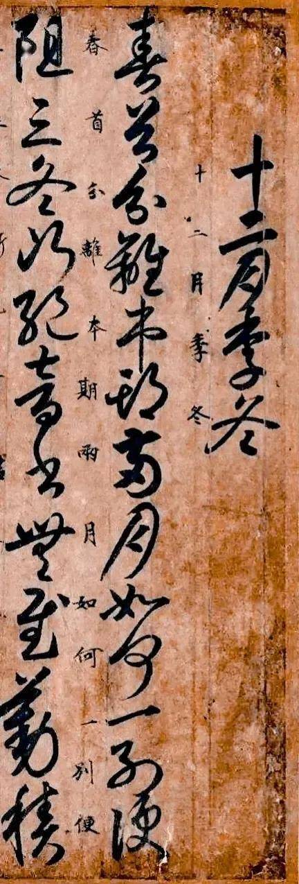 此帖以 “月仪” 为体,是按月编排的友人书信模板,现存三至十二月共九篇尺牍,缺失正月、二月、五月内容,正文以草书书写,计 53 行 541 字,每字旁又附 54 行 544 字小楷释文,草楷相映,成为作品的一大特色。帖尾仅有 “吾前后书,叭此本佳也” 九字,似是书者自感得意的题识,仿佛让后人得以窥见千年前书者落笔后的欣然。
