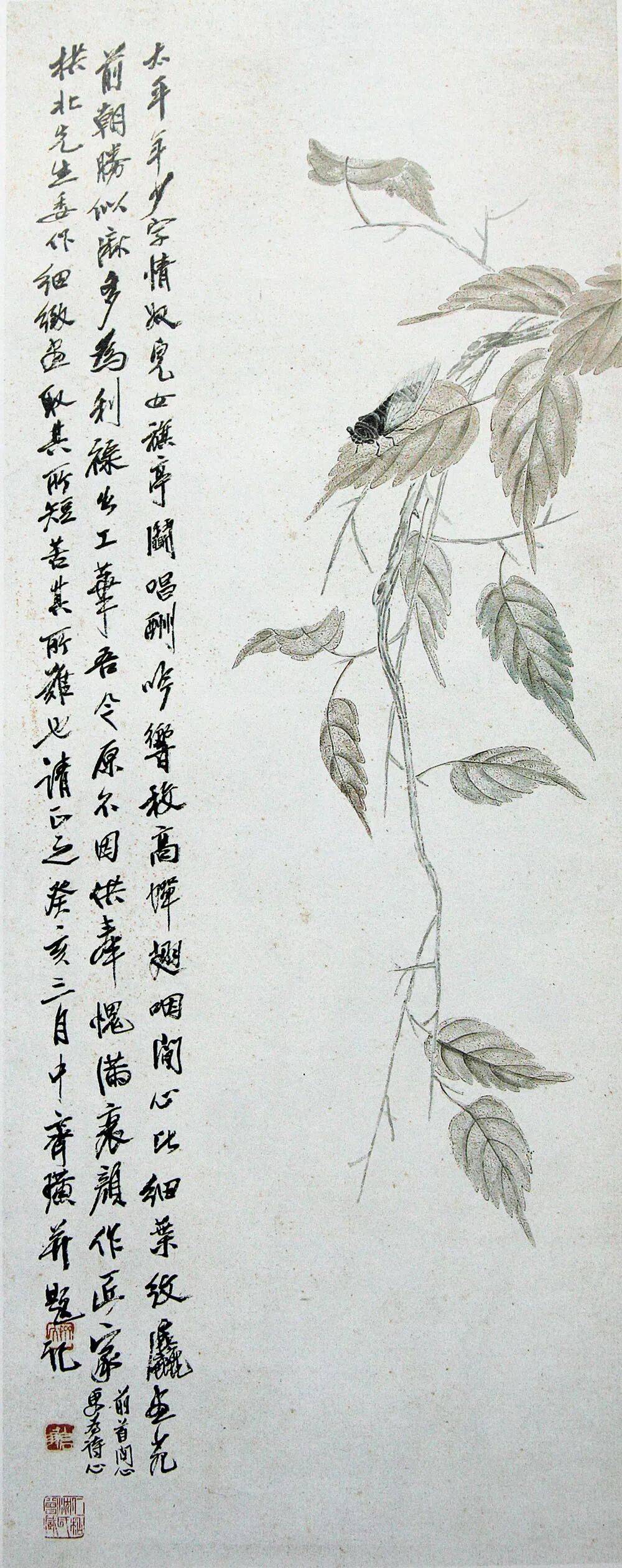 另外,注重技法的创新,形成独特的艺术语言,构成了齐白石艺术的外在形态。尤其画虾那生动而明快的墨色,花鸟画墨与色的强烈对比,浑朴稚拙的造型和笔法,十分彰显功力。还有精致入微的草虫,使画面工与写的极端对比,平正见奇的艺术构成,成为齐白石独特的艺术语言和视觉况味。情感与技法相结合,创作的出新,形成了齐白石艺术的总体风格。