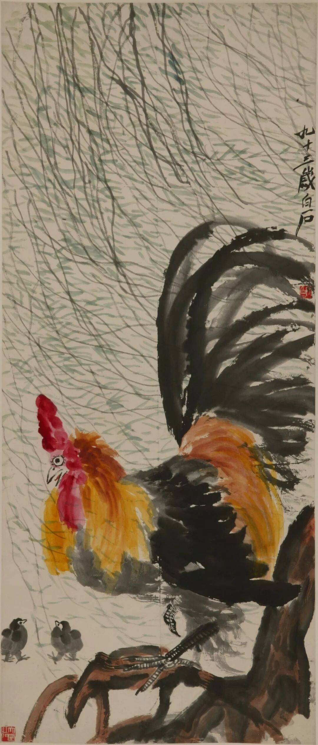 齐白石 柳荫公鸡 152.2×65.4cm 1953年