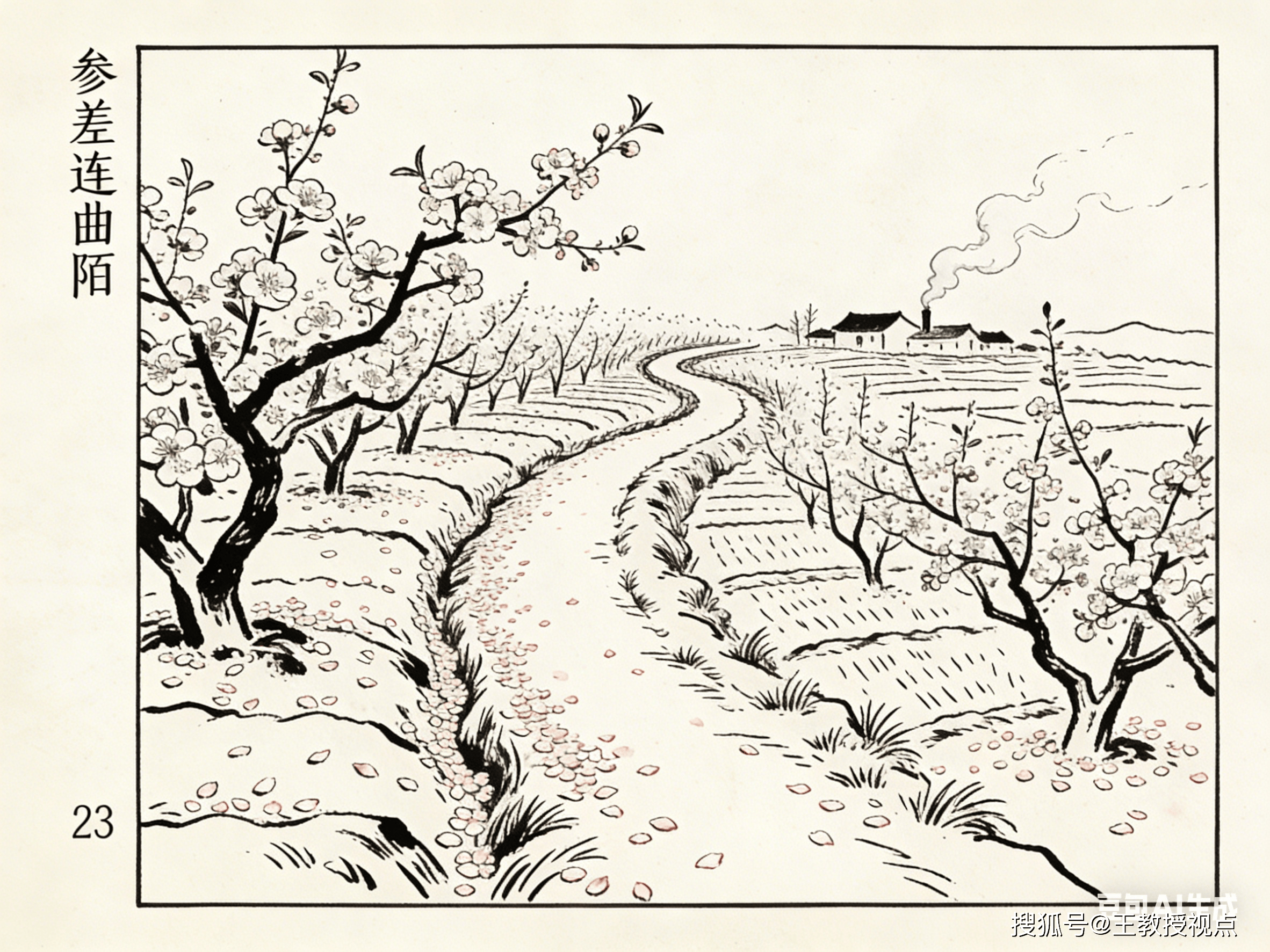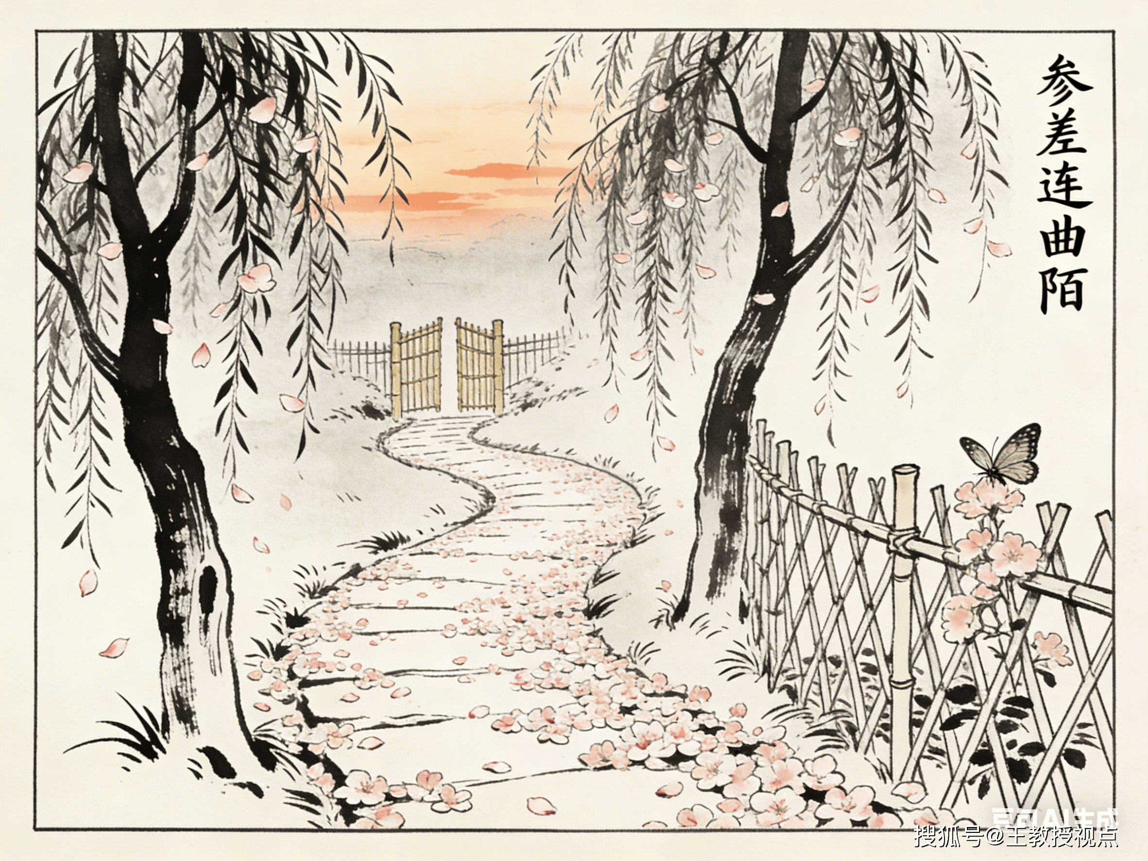 “参差连曲陌,迢遰送斜晖。”颔联承接首联的“花乱飞”,从空间与时间两个维度,细致描摹落花的情态。“参差”形容落花高低错落、长短不齐之态,它们随风飘荡,最终铺满“曲陌”——曲折的田间小径。一个“连”字,写出落花数量之多,范围之广,从园内向园外蔓延,将残春的萧瑟铺展至更广阔的空间。