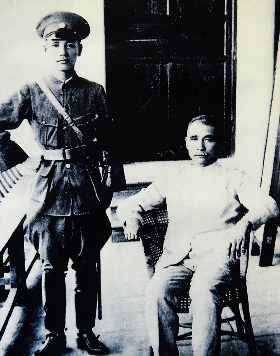 蒋介石还跟孙中山拍了一张合影,照片里孙中山坐着,蒋介石站在他身后。