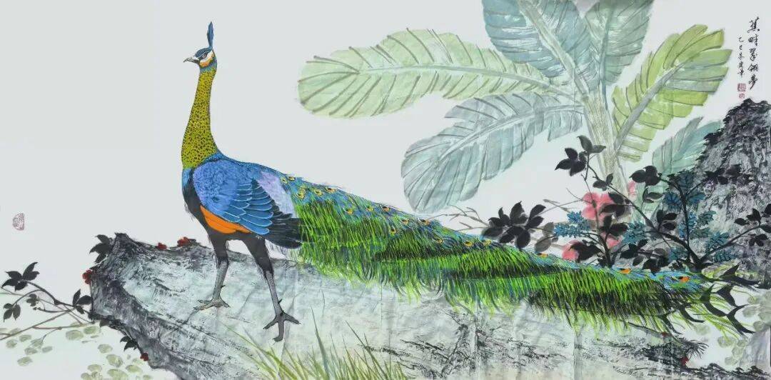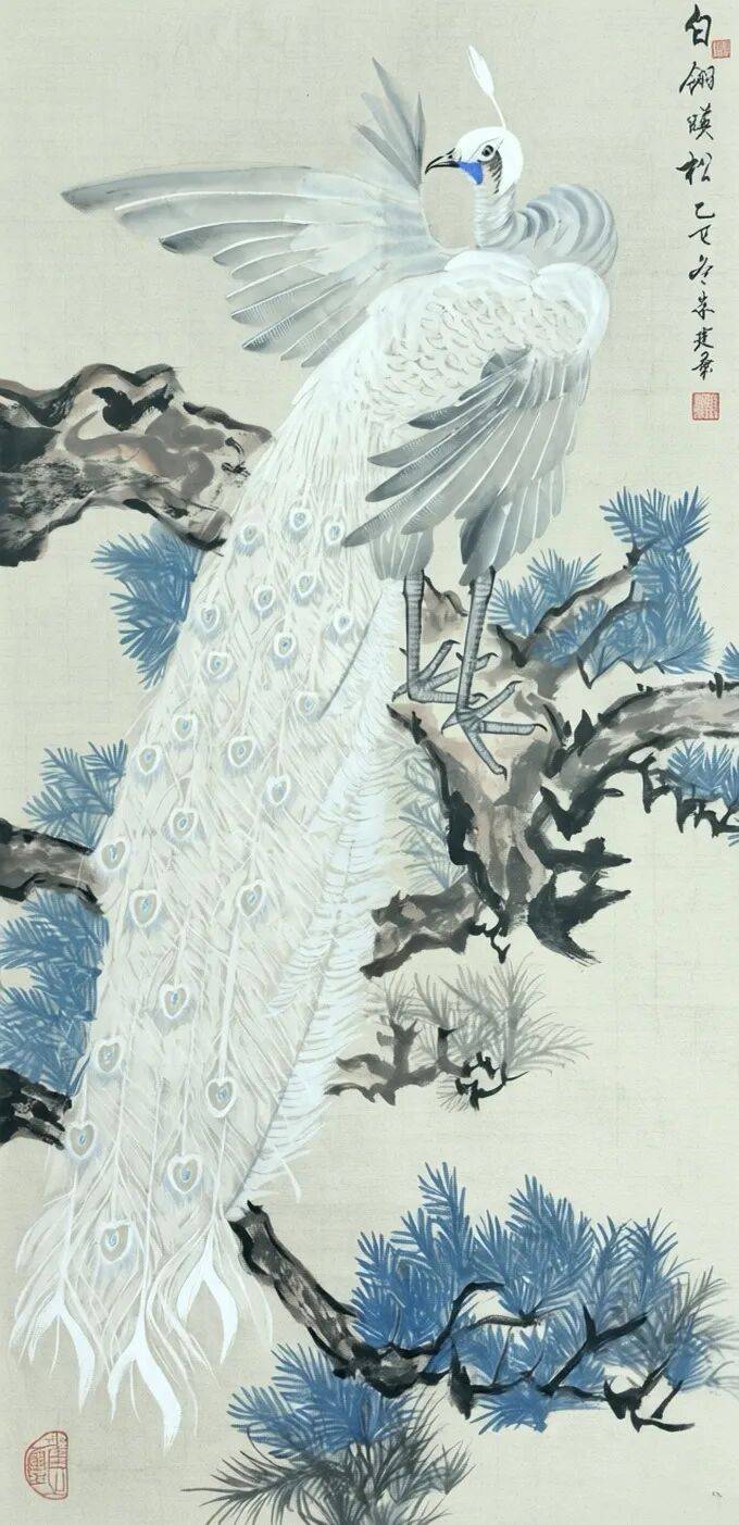 朱建华画孔雀,除了师承海派花鸟之外,还专攻云南袁派“全景孔雀”风格,展现出了一种大花鸟画的风范。在花鸟画创作上,朱建华还兼收并蓄,借鉴吸收了张书旂、王雪涛、江寒汀,尤其是周一云、孙建东等现代名家的创作技法。他画的孔雀,形神兼备,高贵典雅,栩栩如生。中国美术家协会理事、上海市美术家协会副主席陈琪评价其画“有小写意正脉之象”。中国美术家协会理事、浙江省美术家协会原常务副主席骆献跃认为,朱建华的小写意中国画作品“取法传统、别具一格”。