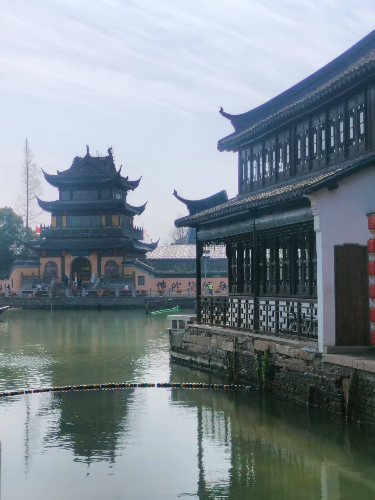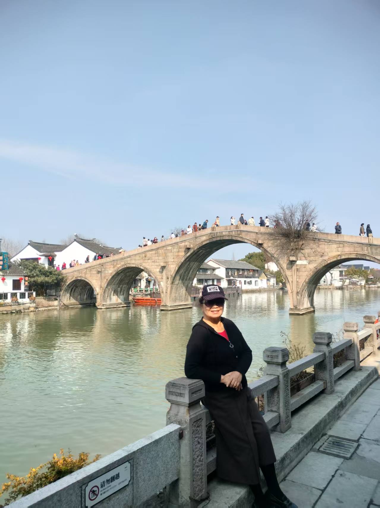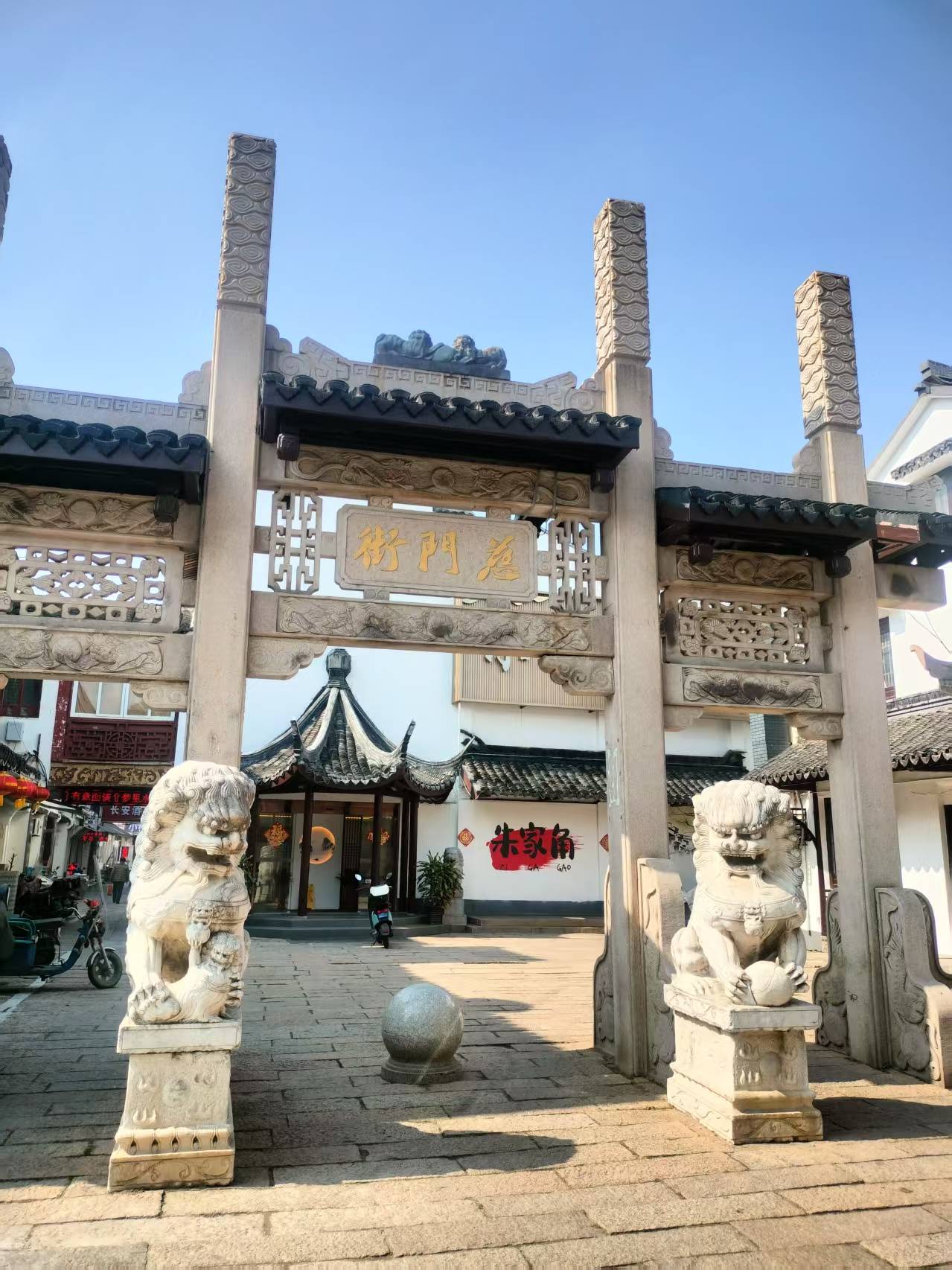 从游客中心出来,穿过那片喜庆的红,便望见了那座著名的石桥——放生桥。它静静地横卧在漕港河上,五孔相连,宛如一条苍青色的巨龙。这便是朱家角的魂了。我拾级而上,脚下的石阶被无数行人的脚步磨得温润光滑,每一块都似乎藏着故事。扶着桥栏,向河面望去,冬日的阳光碎成一河金箔,随着水波轻轻漾开。忽然想起那个传说:明代有个叫性潮的和尚,母亲因渡船倾覆,在危急中生下他便撒手人寰。性潮被救后出家为僧,为纪念母亲,也为了让百姓免于渡船之险,四处募化,终于在隆庆五年建成了这座桥。桥成之后,他又在桥下划出水面,每逢初一十五,便买来鱼鳖放生,桥也因此得名。四百五十多年过去了,性潮的慈悲,连同这座桥,一起留在了人间。桥顶四角的石狮,憨憨地蹲着,望着来来往往的人;桥壁的楹联,字迹依稀可辨:“帆影逐归鸿锁住玉山云一片,潮声喧走马平溪珠浦浪千重”。想当年,这漕港河上,千帆竞发,樯橹如林,是何等的繁华景象!