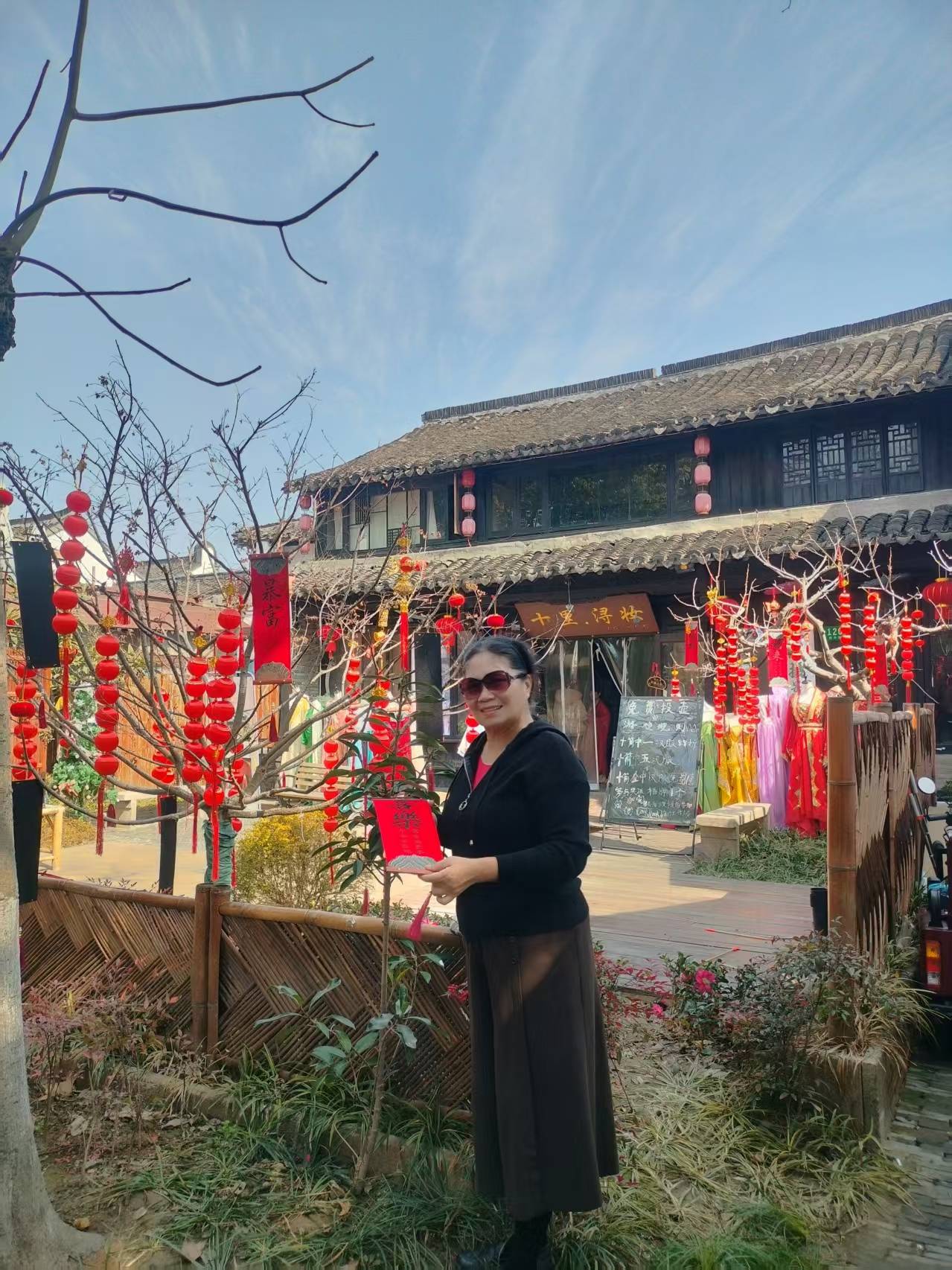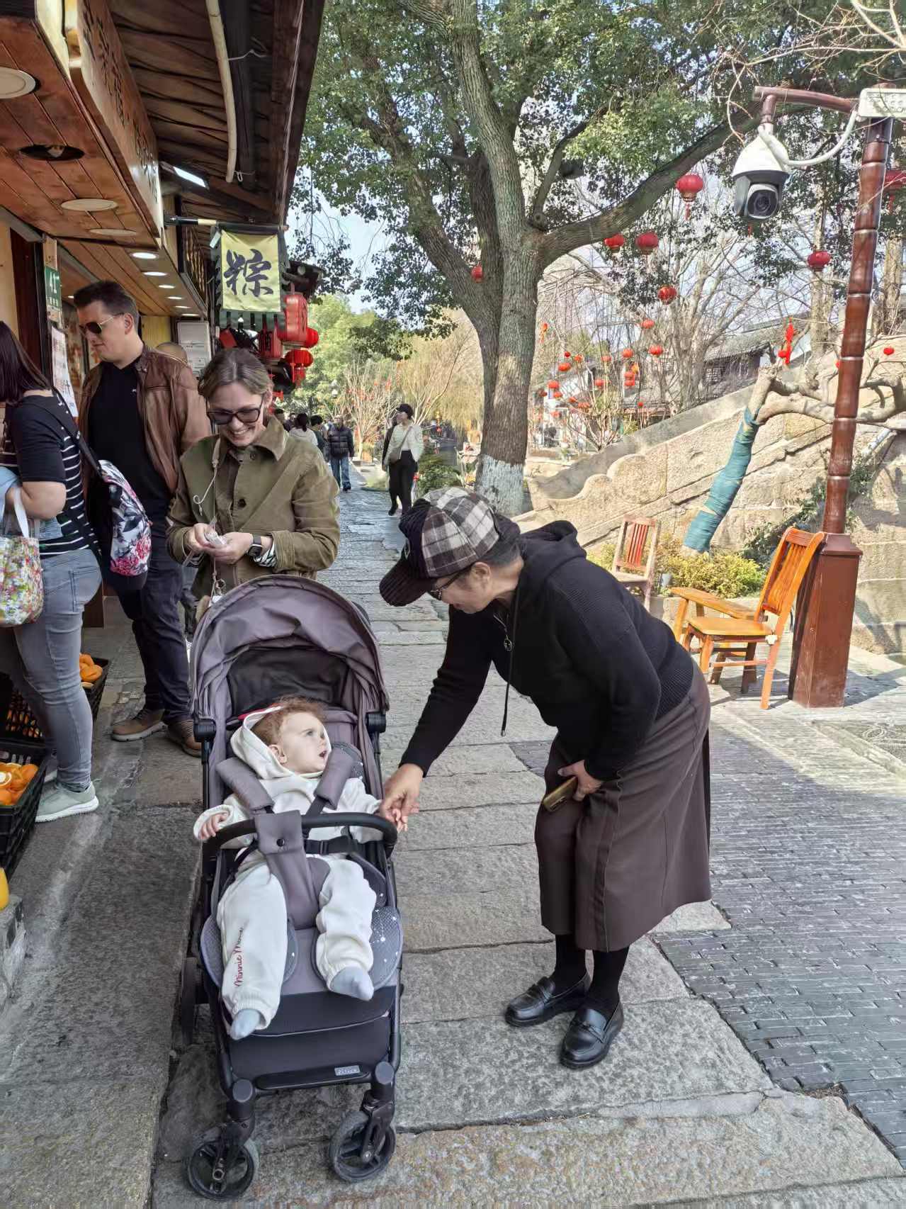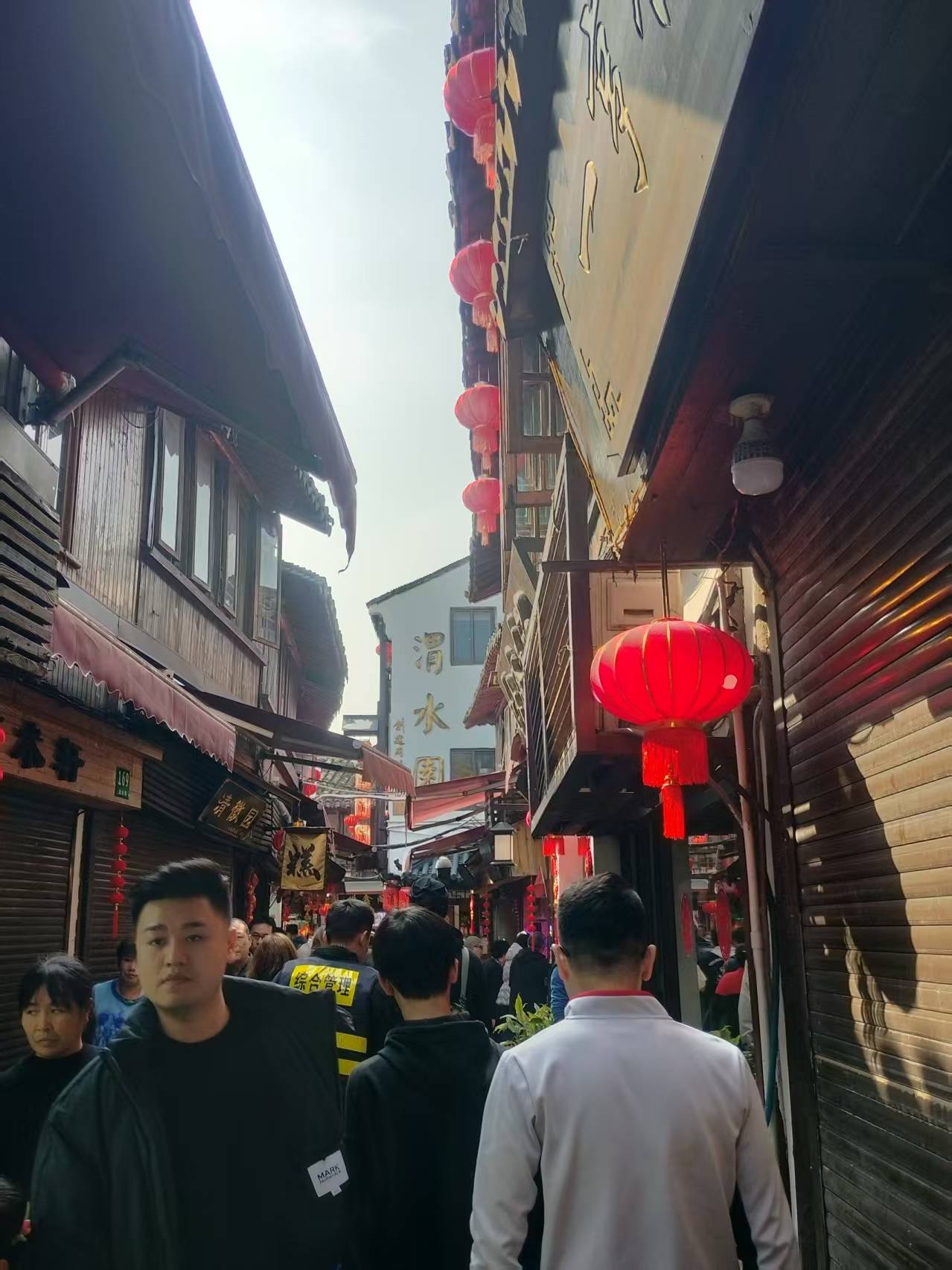 顺着老者指引的方向,远远望见古镇的入口,那一溜儿高高挂起的大红灯笼便撞进了眼里。沿街的屋檐下,福字、喜字、小红花,密密匝匝的,像是把整个春节的热闹都提前搬到了这里。虽是冬日,中午的艳阳却有几分夏日的热力,竟有年轻人穿着汗衫走过,几个姑娘的汉服也是薄薄的罗衫,轻盈得很,恍惚间,倒像是走进了仲春时节的江南。