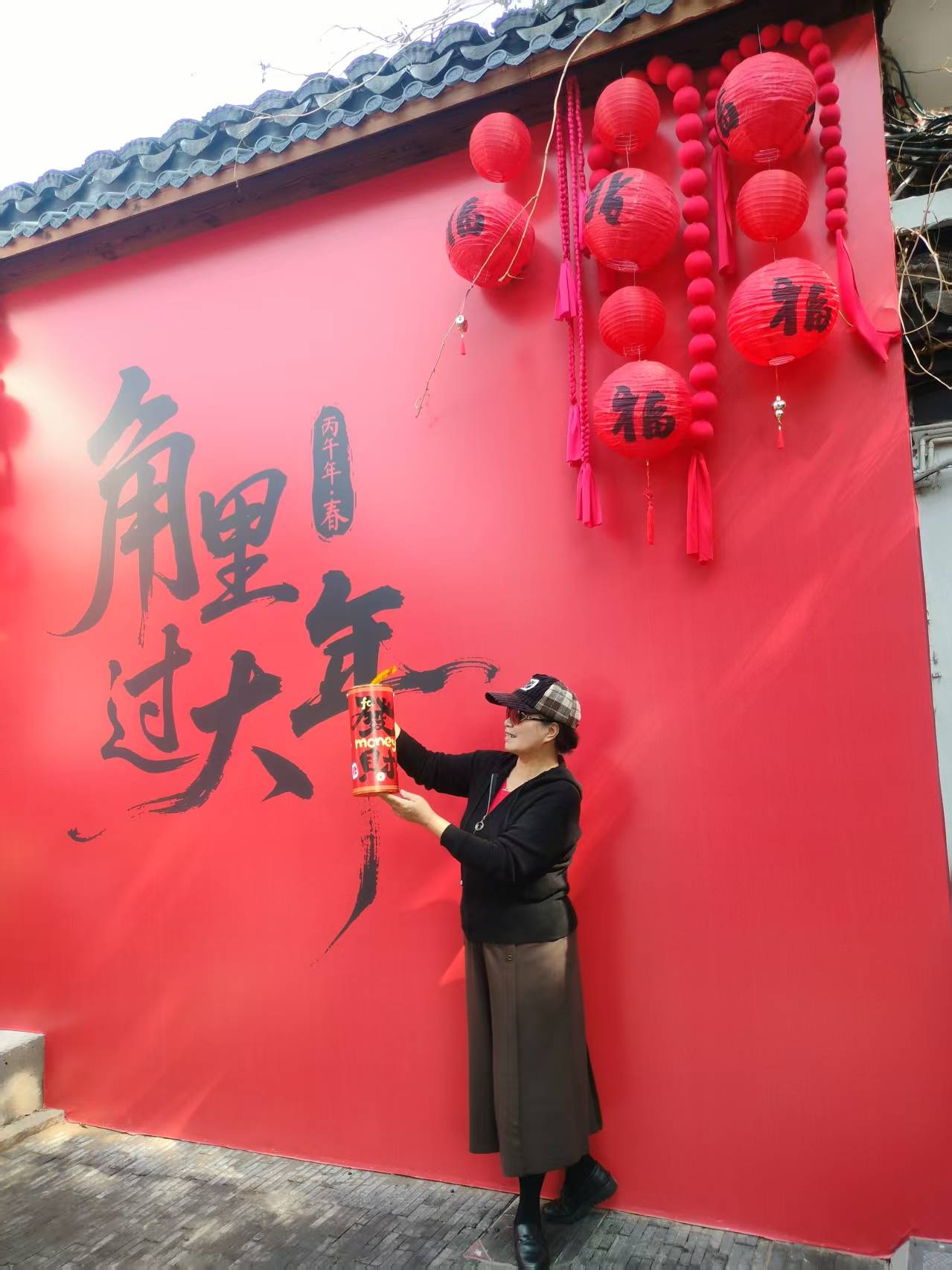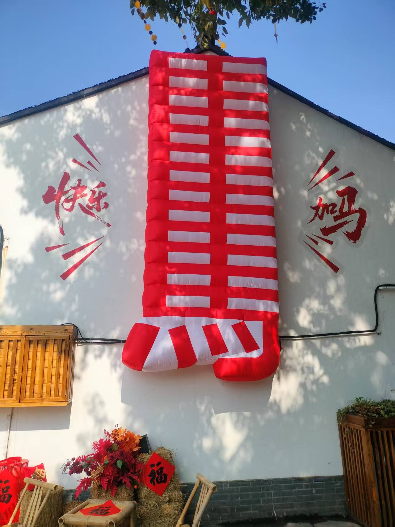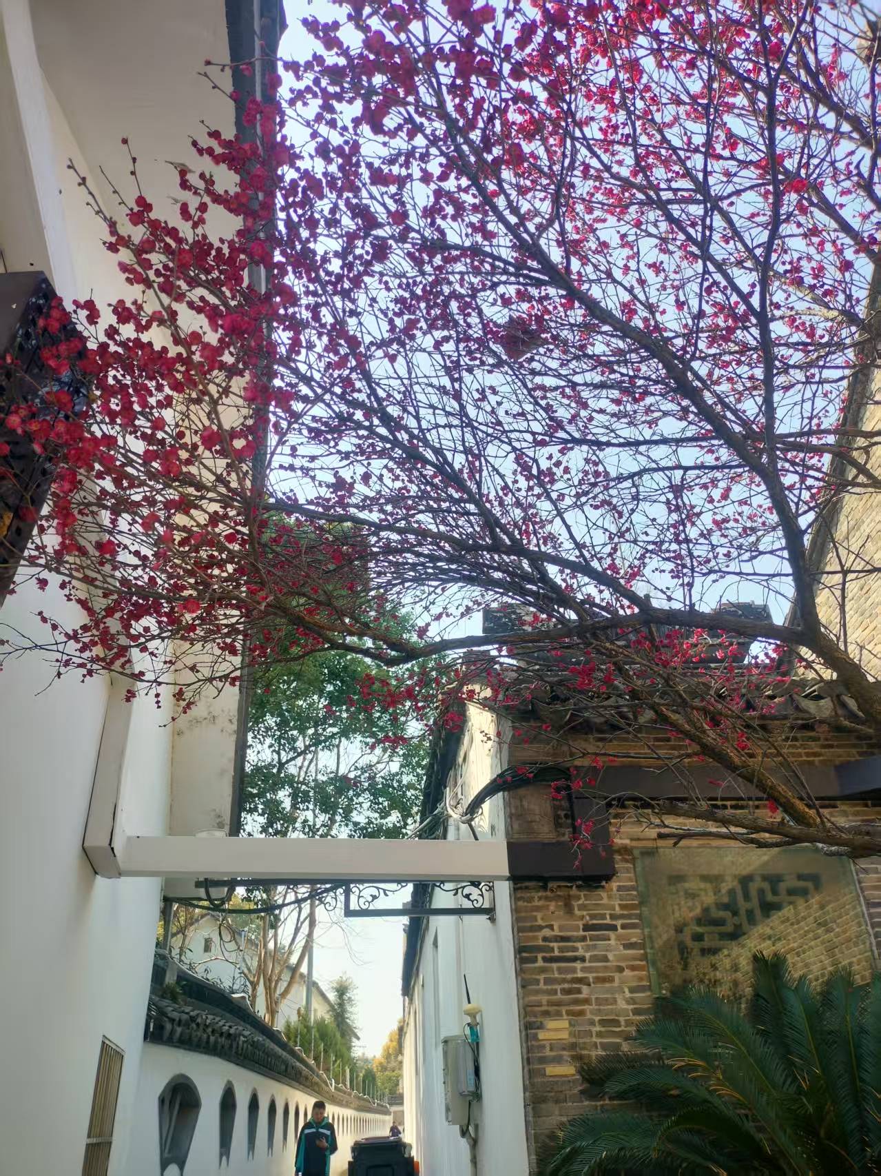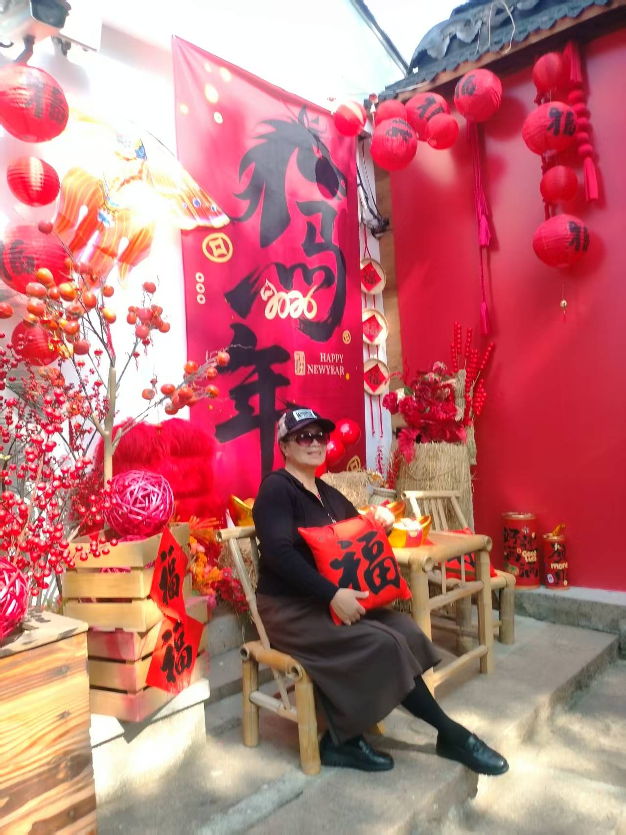 顺着老者指引的方向,远远望见古镇的入口,那一溜儿高高挂起的大红灯笼便撞进了眼里。沿街的屋檐下,福字、喜字、小红花,密密匝匝的,像是把整个春节的热闹都提前搬到了这里。虽是冬日,中午的艳阳却有几分夏日的热力,竟有年轻人穿着汗衫走过,几个姑娘的汉服也是薄薄的罗衫,轻盈得很,恍惚间,倒像是走进了仲春时节的江南。