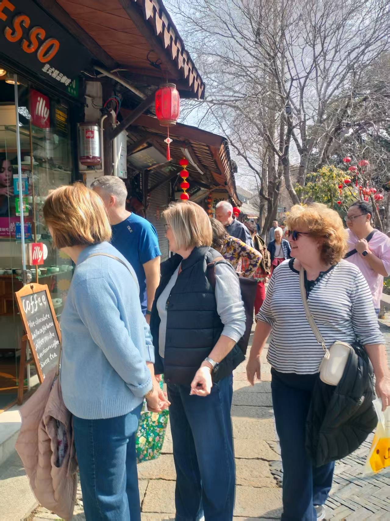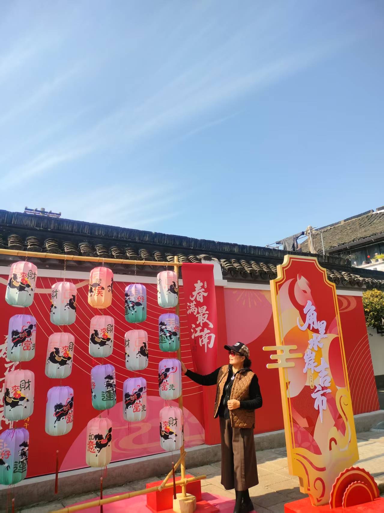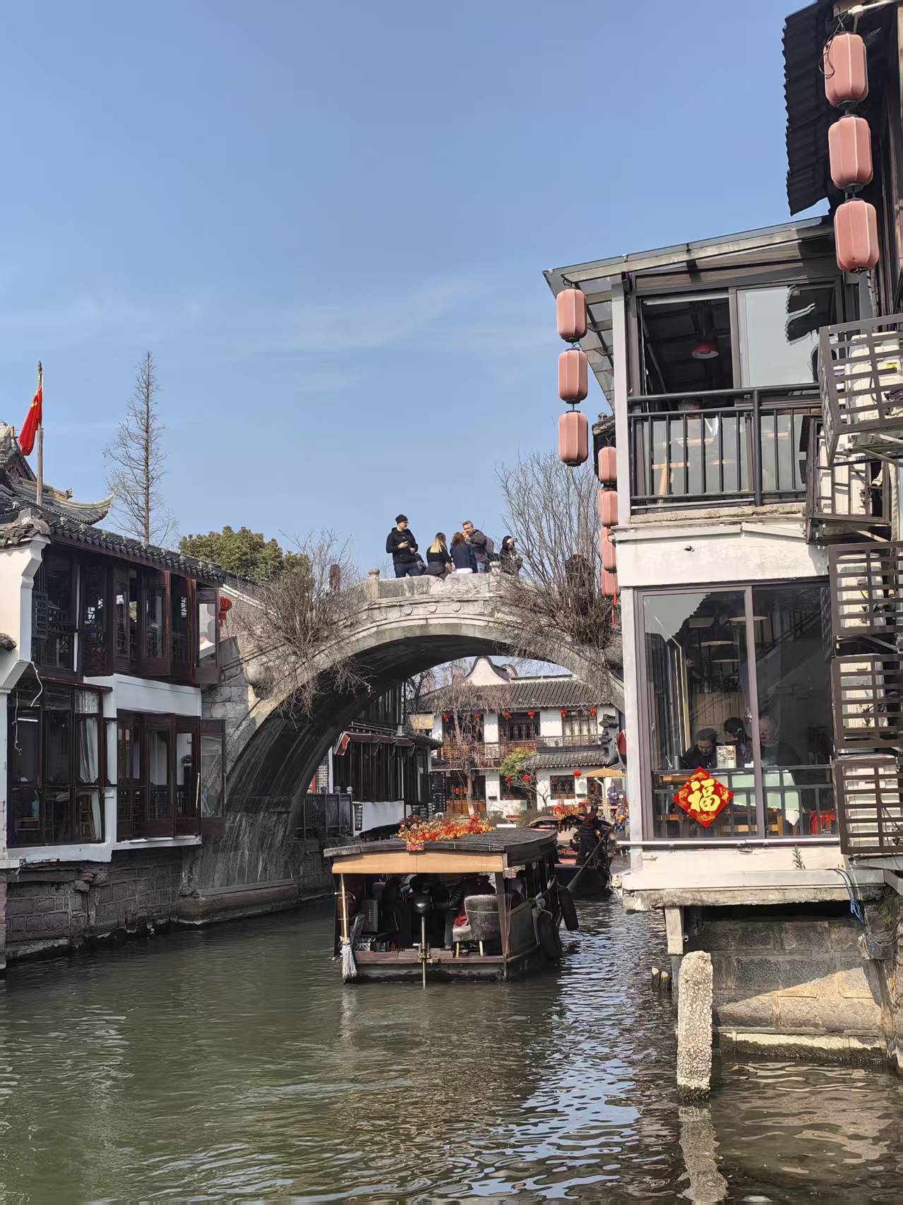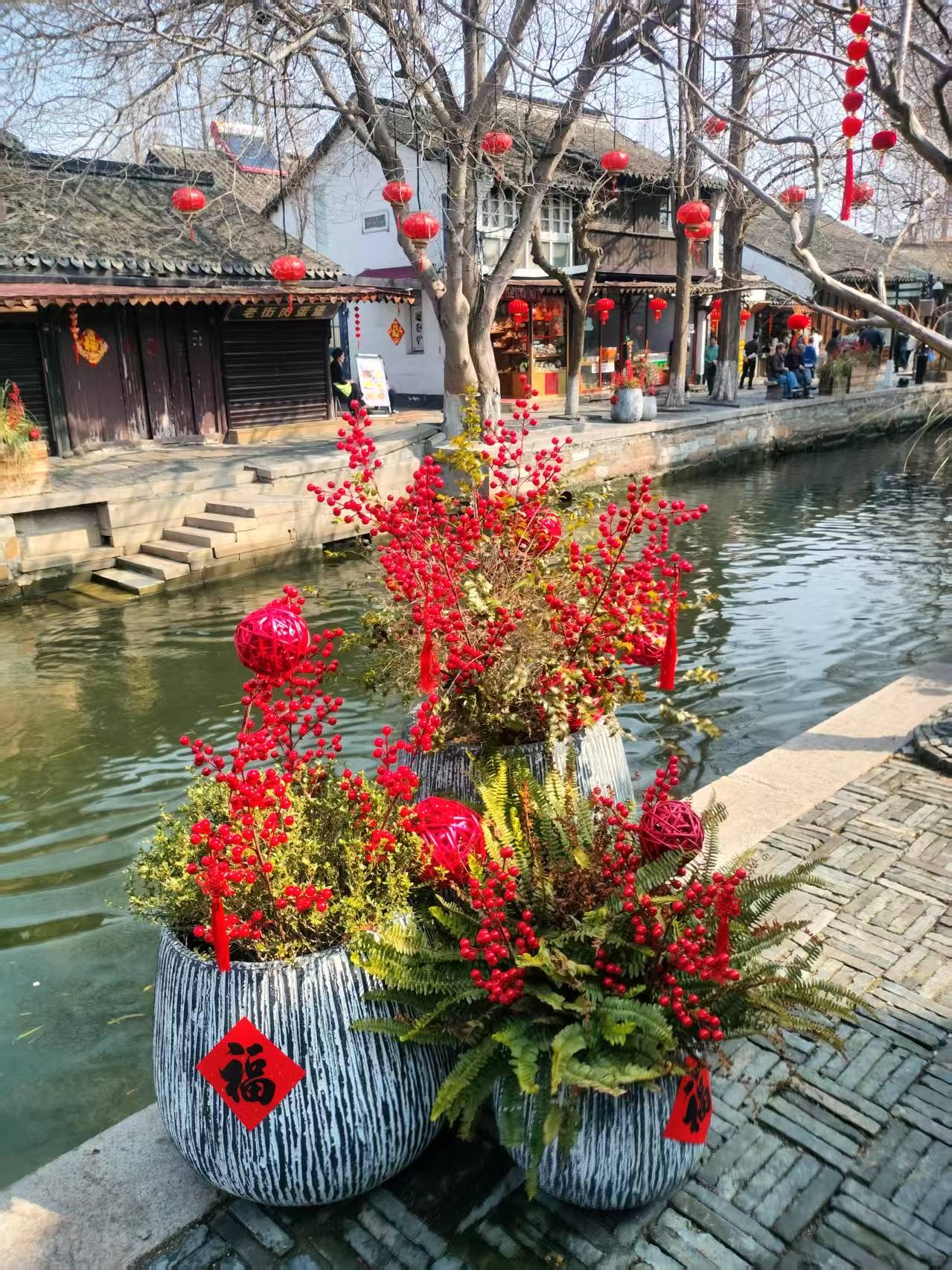 小河中,游船来往穿梭,很是热闹。船上的游客操着不同的语言,笑声和快门声此起彼伏。仔细看去,竟有不少外国友人,也拖家带口地来了。他们穿着鲜艳的服饰,有的举着相机对着两岸的粉墙黛瓦和拱桥流水不住地拍照,有的则安静地坐着,任凭摇橹船悠悠地晃,那新奇与赞叹的神情,为这古老的水乡平添了几分国际化的热闹。想来他们也是来感受中国春节的吧,在异国的水乡里,寻找一份属于自己的年味。