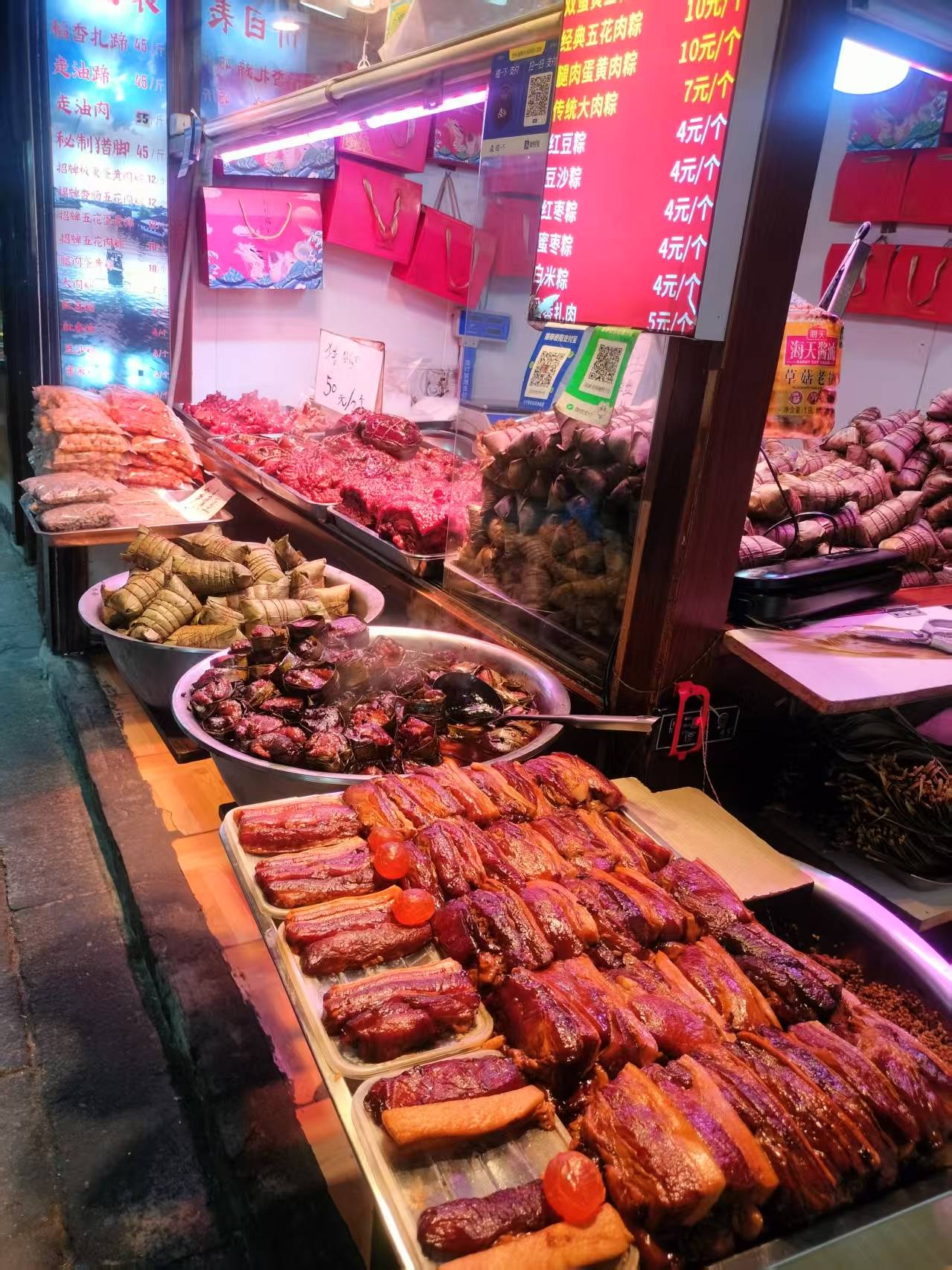 走着走着,一阵香气飘来,是阿婆粽。铺子不大,糯米粽、五花肉、咸蛋黄,充满了水乡的味道。