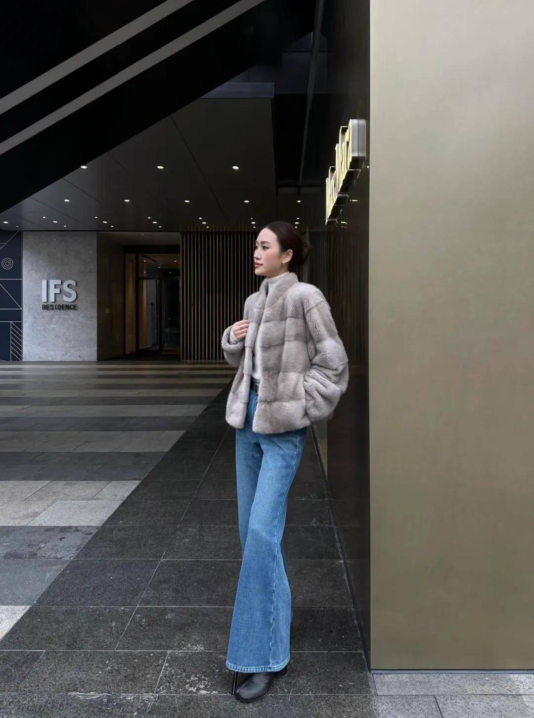 白色皮草外套色调柔软有质感,会显得很有高贵典雅的气质,搭配蓝色牛仔裤,整体造型休闲随性又不失精致,显得很接地气。
