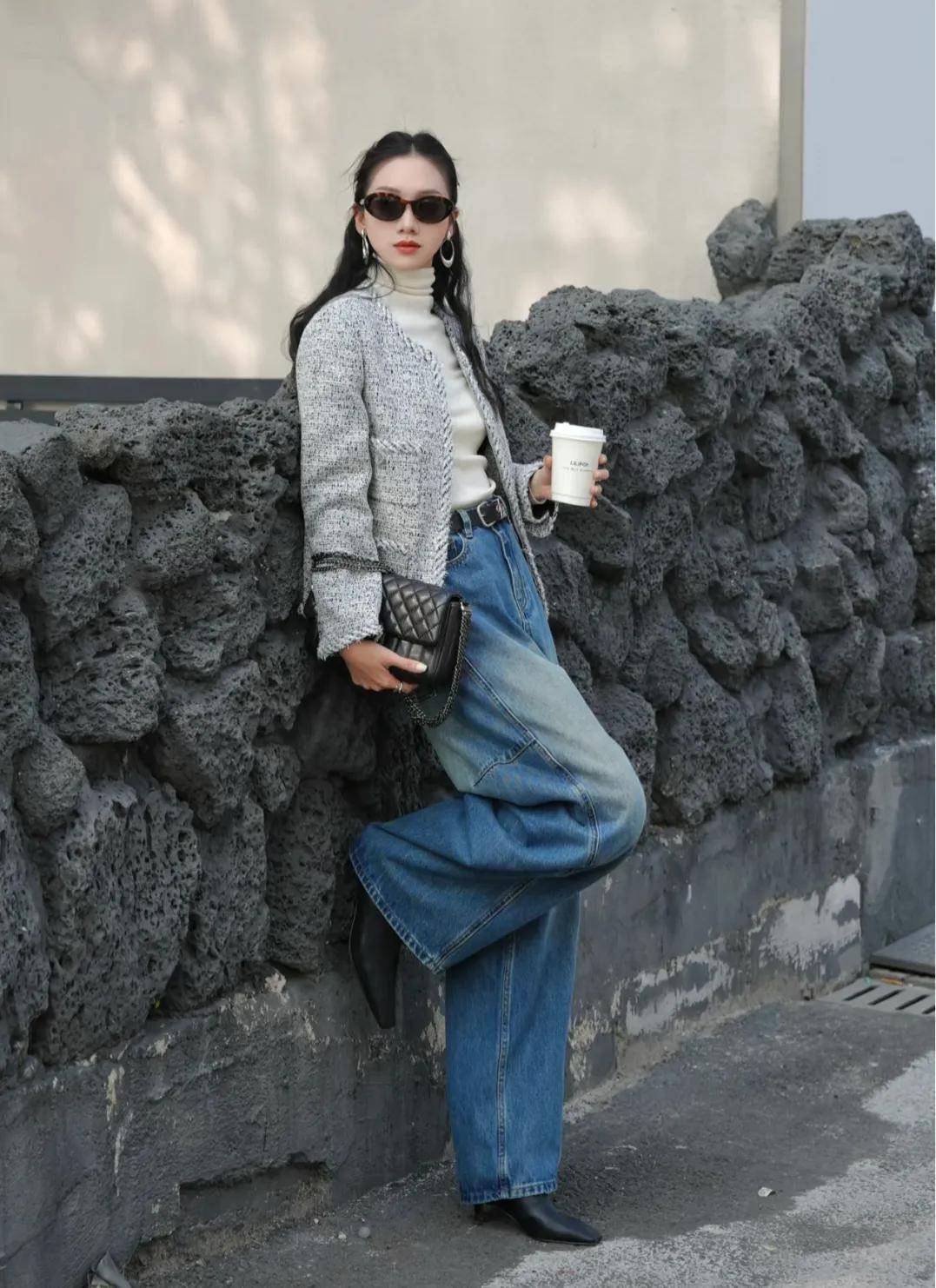 这种配色既简约又时尚,给人一种低调而优雅的气质,同时牛仔裤的休闲感可以中和灰色可能带来的沉闷感,整个人看起来显得得体大方,舒适又不失品位。
