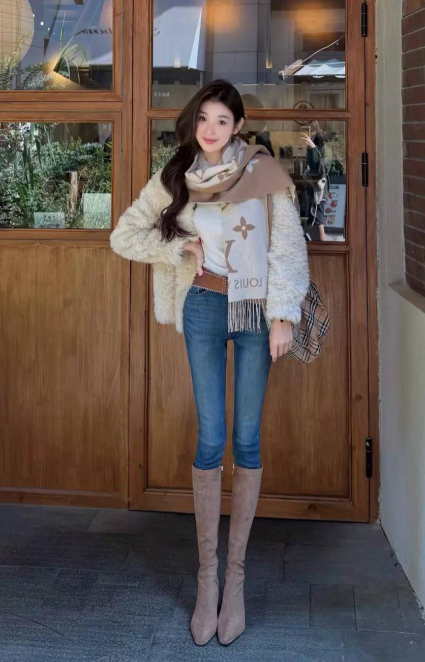4.白色皮草+牛仔裤