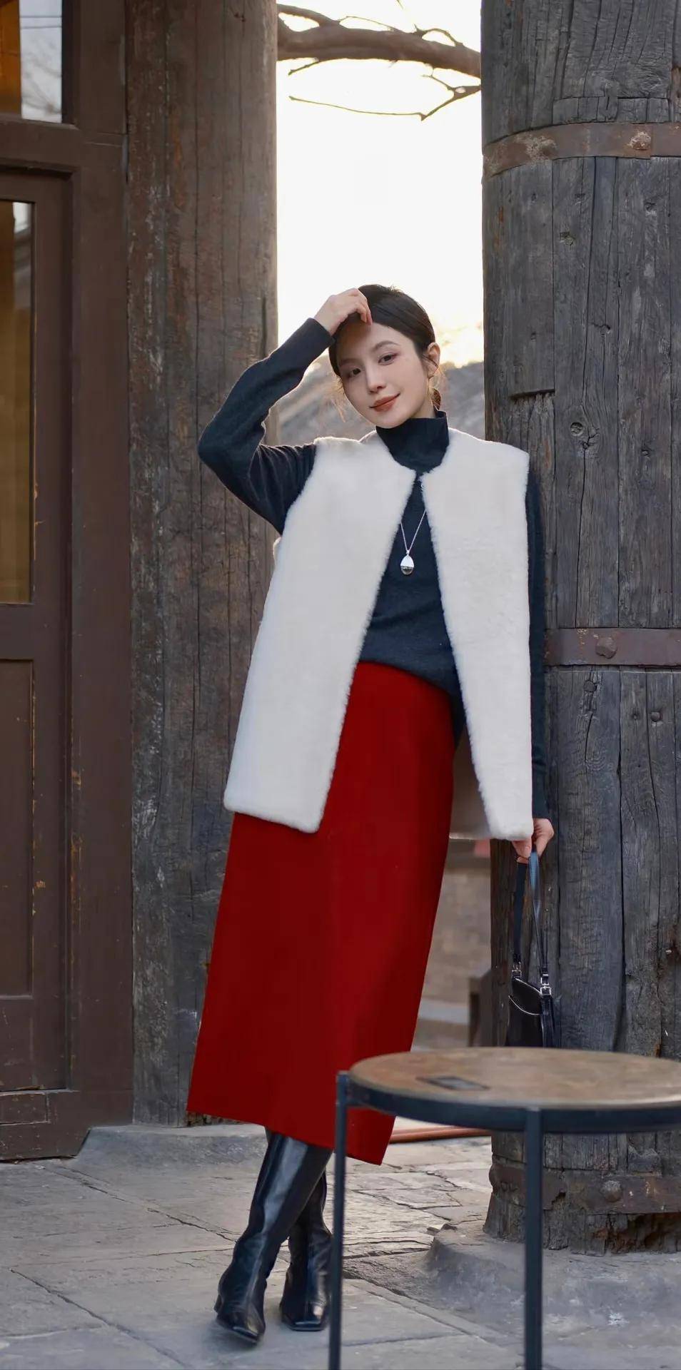 或者穿一条红色毛呢半身裙搭配一件白色的羊绒马甲,内搭一件黑色高领毛衣和一双黑色长筒靴,既时尚又显得很有审美眼光,成为了春节聚会中一道亮丽的风景线。