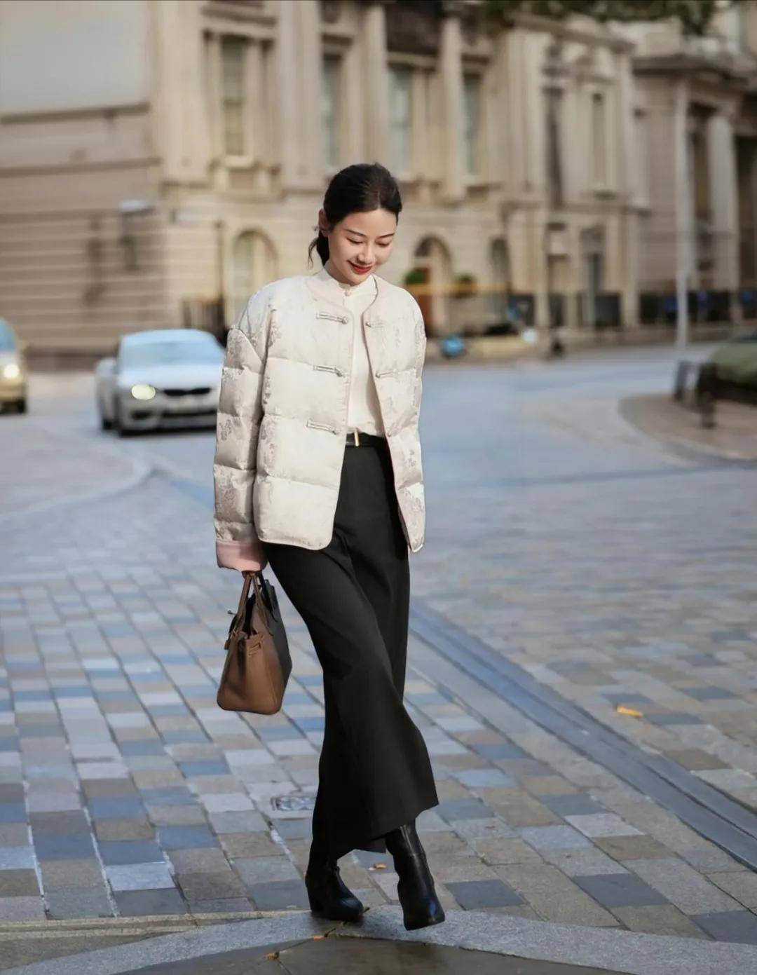 穿一件中式风外套,搭配一条黑色半身裙长裙,穿一双长筒靴,营造出一种既古典又时尚的氛围。