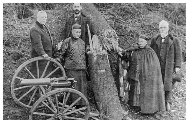1896年,这幅照片展示的是马克沁机关枪的发明人马克沁爵士(Sir Hiram Stevens Maxim)与清朝驻英国公使龚照瑗在一起的情景。马克沁在郊外演示自己的机关枪向清政府展示这款武器的威力。