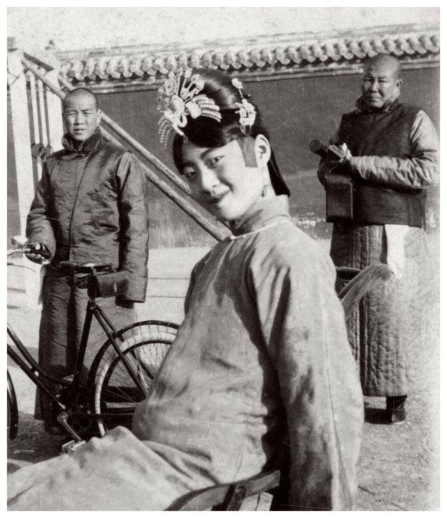 这张照片拍摄的是溥仪的皇后婉容。照片拍摄时,婉容刚刚和溥仪结婚,站在她身后的两名太监为她服务。