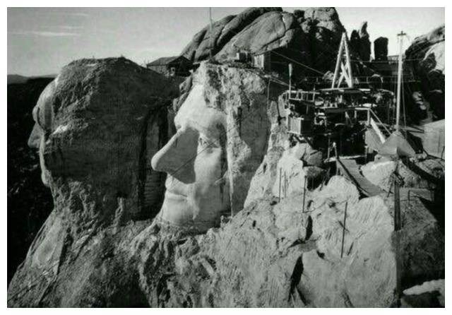 左边这两张照片是美国总统山雕刻过程中的留影。雕刻这些人物面孔可不是一件容易的事。整个工程从1927年开始,到1941年才完成,花费了整整14年时间。