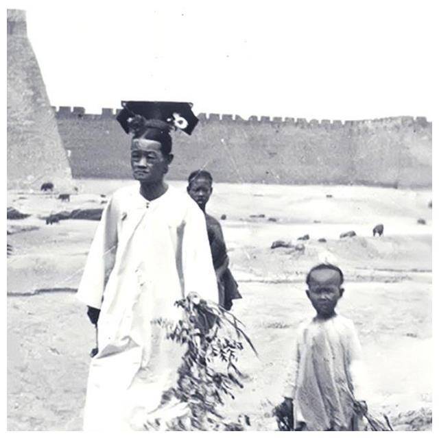 这是清朝末期的一个场景,画面中的这位旗人妇女走在北京城墙下。当我们放大她的面孔后,却发现她的长相与某个现代人极为相似……