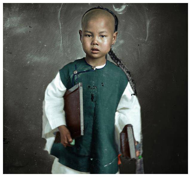 这幅照片展示的是清末时期的一位中国学童。