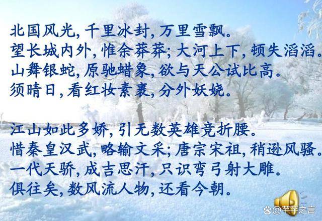 这其中,毛主席所展现的气势,不仅仅是文字上的表达,而是整首词的宏伟气氛。看看两首词的写景部分:苏轼的乱石穿空,惊涛拍岸,卷起千堆雪,毛主席则写道千里冰封,万里雪飘……看红妆素裹,分外妖娆。细细读来,毛主席的词在景象的铺陈上更具雄浑气派,气势磅礴、韵律浑厚。