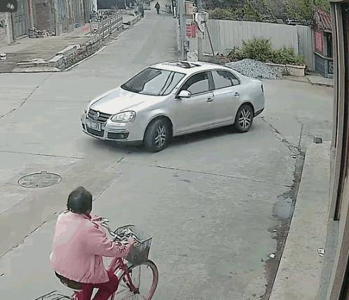 从郑女士提供的完整的监控录像中,我们可以清晰地看到,那名大妈当时正在村子里骑自行车,前方有一辆银白色的轿车驶过,于是大妈便向右方稍作避让。
