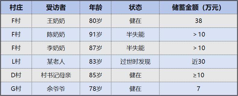 典型案例包括:F村80岁王奶奶有38万元积蓄;同村91岁半失能老人陈奶奶银行账户上有10余万元;87岁半失能老人李奶奶自己手头亦有10余万元;L村一位83岁老人去世后被家人发现存有近30万元;D村村书记的85岁母亲也攒到了至少10万元;G村78岁余爷爷手头存有7万元。