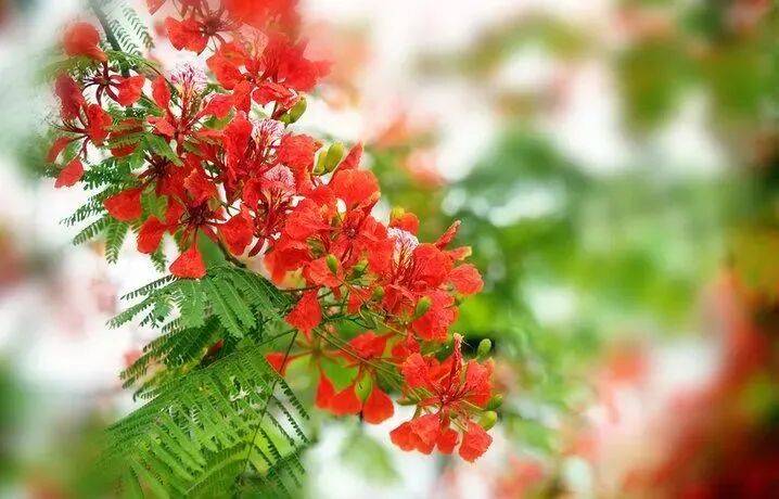 凤凰花,别名金凤花,属豆科,落叶乔木,高可达二十米。二回羽状复叶,小叶长椭圆形。夏季开花,总状花序,花大,红色,有光泽。凤凰木以鲜红色或橙色的花朵配合鲜绿色的羽状复叶。