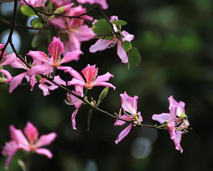 紫荆属豆科,又名羊蹄甲,乔木。叶片有圆形、宽卵形或肾形,顶端裂为两半,似羊的蹄甲。花期在冬春之间,花大如掌,略带芳香,五片花瓣均匀地轮生排列,呈红色或紫红色。