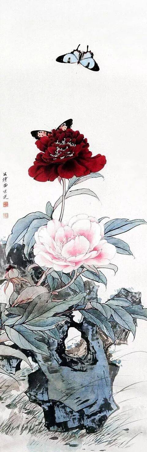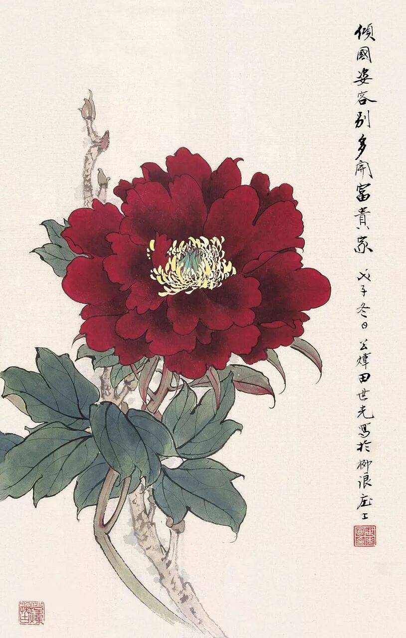 田世光是中国现代工笔花鸟画的重要代表人物,被尊称为 “牡丹之父”,其笔下的牡丹作品以双勾重彩技法著称,融合宋元传统与时代精神,展现出牡丹雍容华贵、婀娜多姿的艺术风范。.