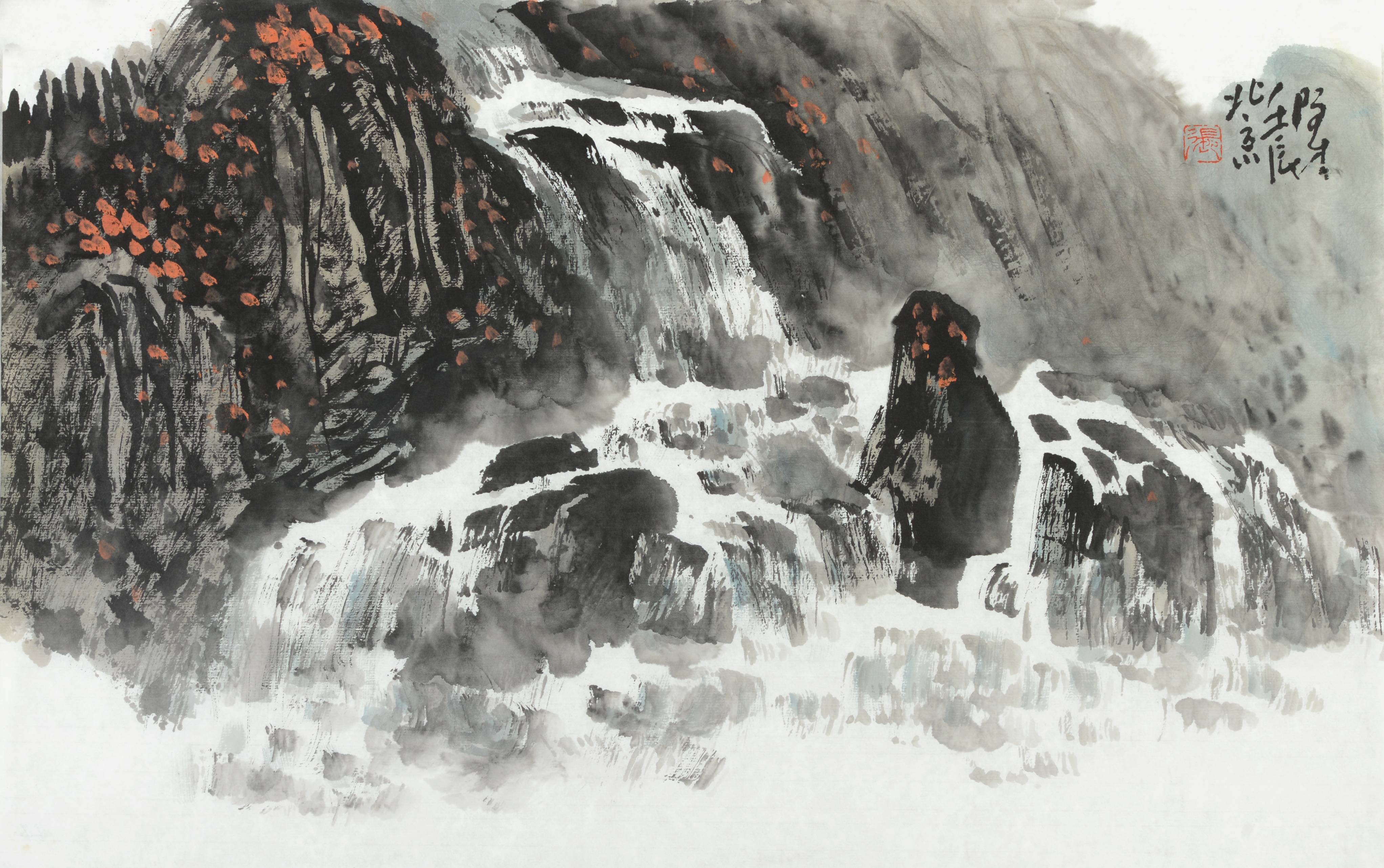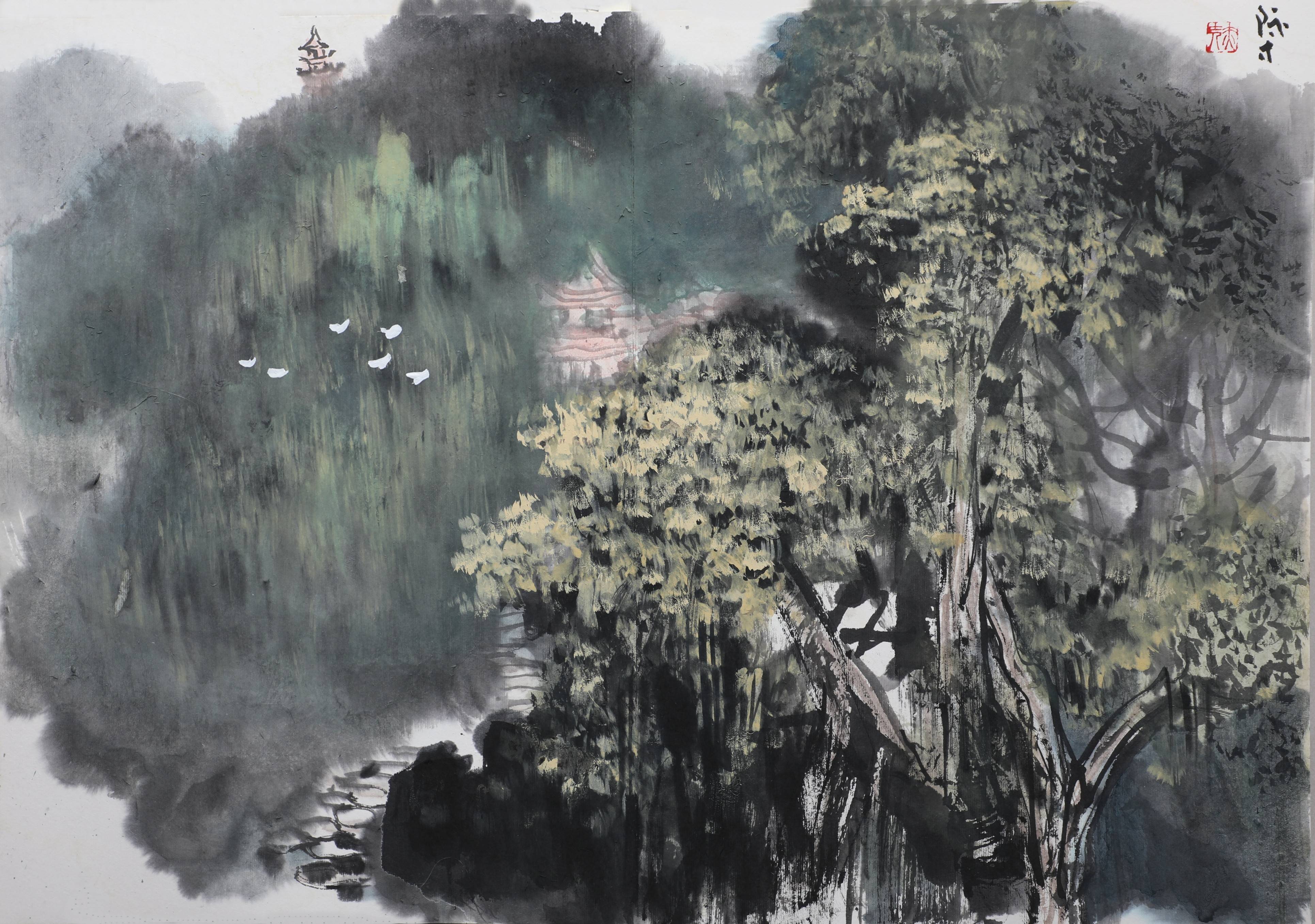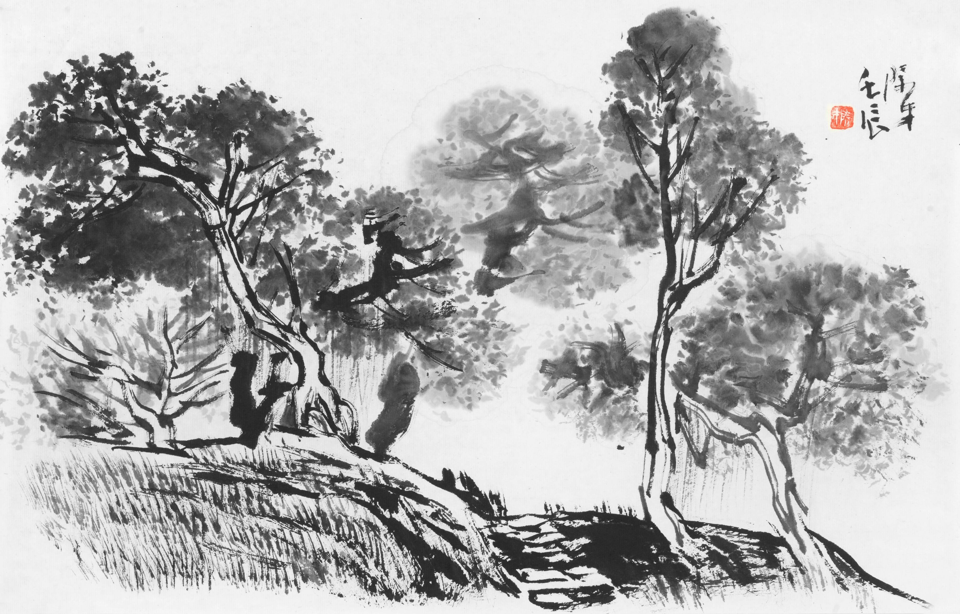 四、“点”是一种调节与平衡。在山水画创作的最后调整阶段,画面的呼应、聚散、平衡,有时要靠苔点来调节,以使整个画面布局、气韵贯通。比如当画面布局感觉有点松散、不聚焦,只“开”不“合”时,或者笔墨关系不统一时,则可用“ 点” 聚而合之,使画面疏而不空、“开”中有“合”、气脉相连。