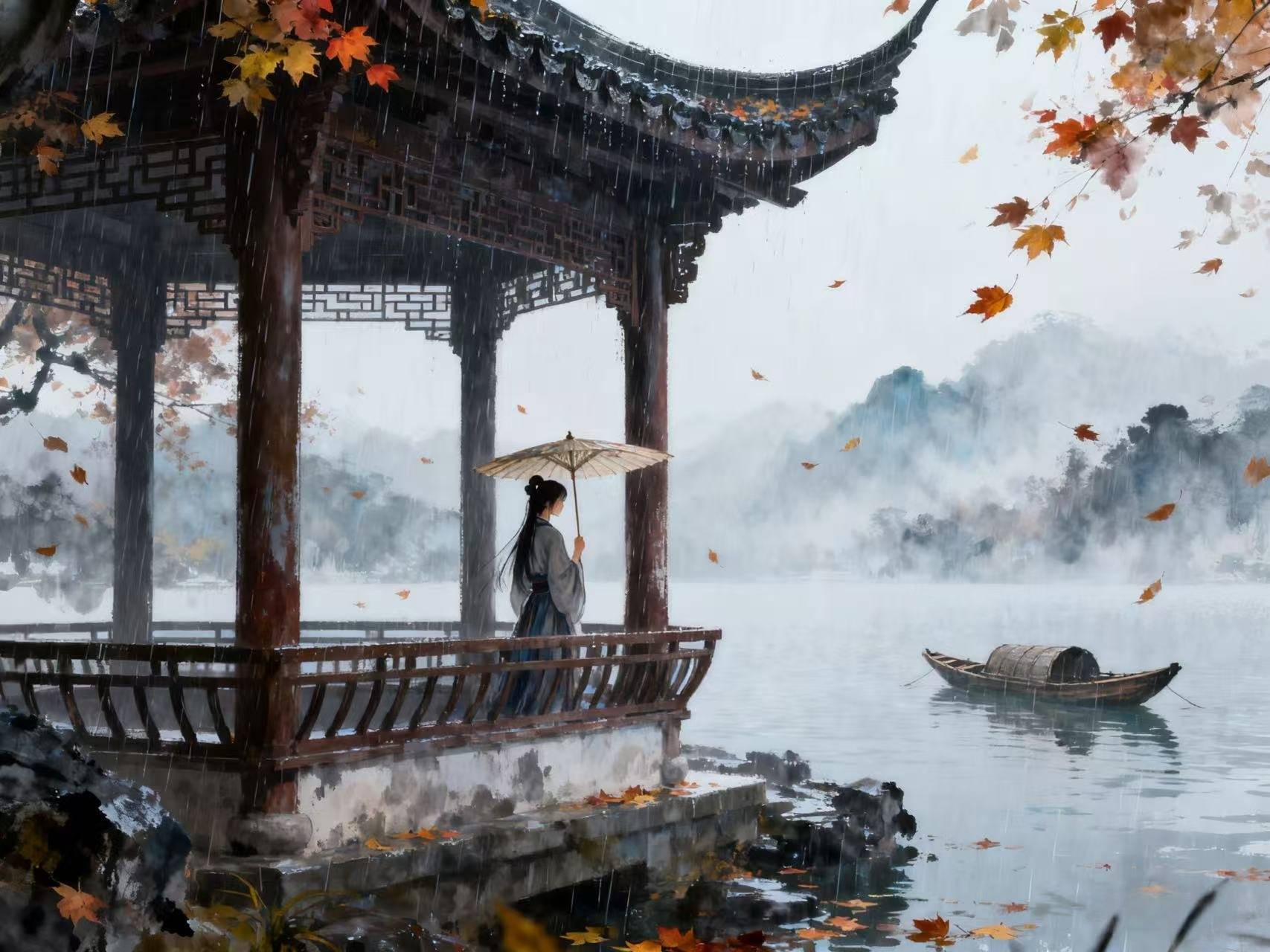 忽然觉得,郑板桥的那条小廊,其实从来没有消失。它就在每个安静的秋天午后,在每个愿意停下脚步的人心里。廊下煮着的茶,是你手里这杯;廊角开着的花,是你窗外那枝;柴门外的秋水,是你望出去的天空;揉碎夕阳的乱鸦,是那只飞过的麻雀。