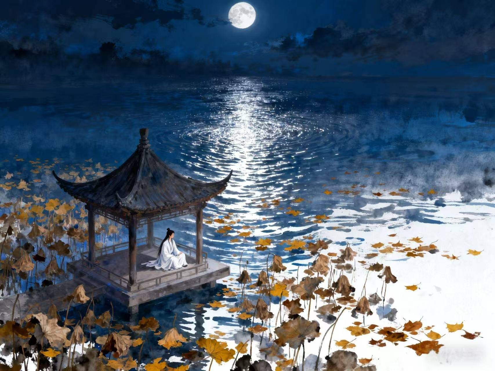 “寂寂柴门秋水阔”,从廊下到门外,从眼前到远方。柴门是关着的,把尘世的喧嚣关在外面;秋水是开阔的,把心事都流放到天边。这一关一开之间,是一个人的精神世界,守住自己的清净,却拥有整个天地的辽阔。