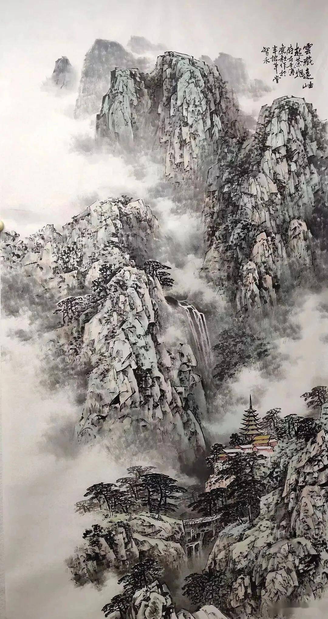 林智永先生之山水,师法传统而不泥古,自出新意而不离宗。其构图或高远、或平远、或深远,深得 “三远” 之妙;其技法或斧劈、或披麻、或没骨,笔墨淋漓,气韵生动;其寓意或寄情山水、或托物言志,于尺幅之间,尽显人生之况味。
