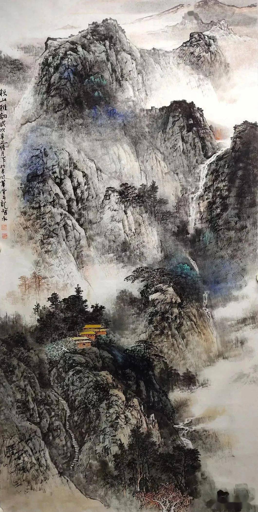 构图:以高远为主,主峰巍峨,栈道自下而上,引导观者视线渐入佳境。近景古木、中景梵宇、远景烟峦,如一幅立体山水长卷,咫尺千里。