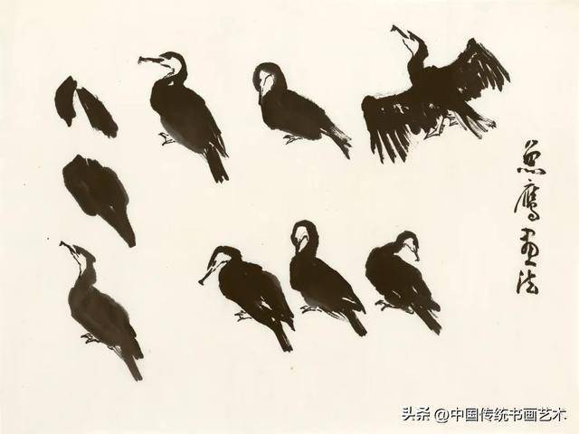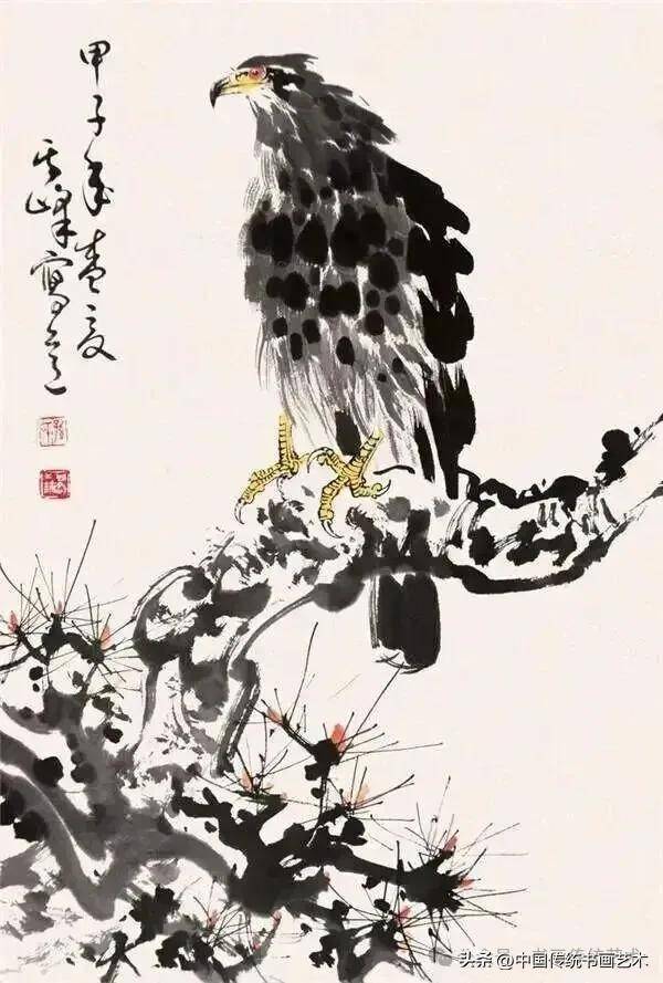 鹰:作为大写意花鸟的代表,鹰的课徒稿强调用笔的苍劲与墨色的层次,通过简练的线条与泼墨结合,表现其威猛与力量感。