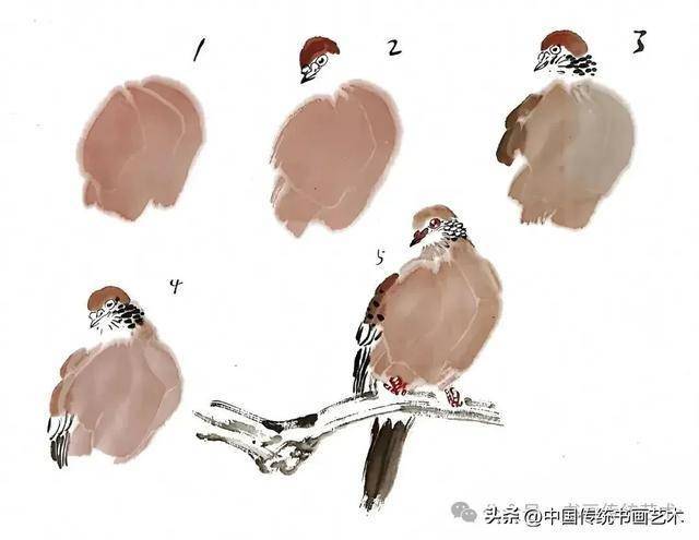 基础训练工具:课徒稿通过分步示范与案例解析,为初学者提供了从线条勾勒到构图完成的完整路径,帮助学习者掌握花鸟画的基本技法。例如,麻雀的绘制从头部点染到尾羽勾画,每一步均有详细说明,适合临摹与练习。