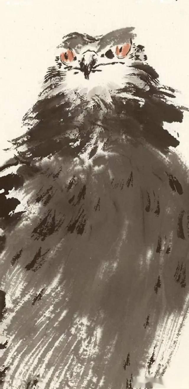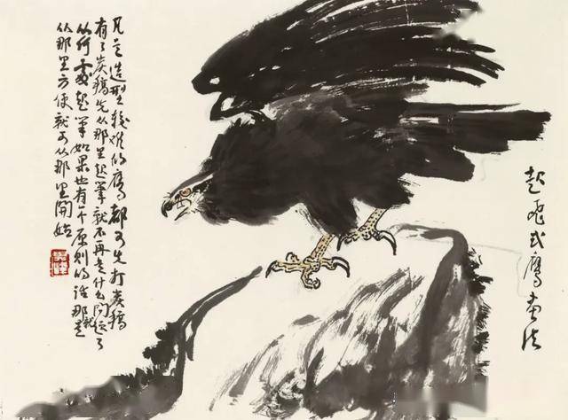 线条与皴擦:鹰的绘制中,孙其峰强调用笔的苍老与力度,通过干笔皴擦表现羽毛的质感,同时结合泼墨营造气势。