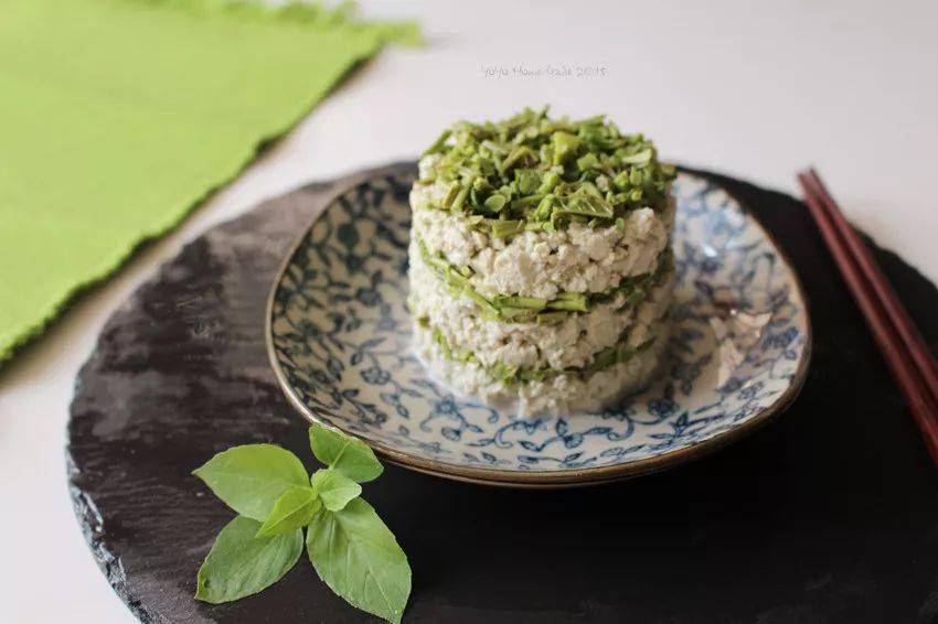 再铺一层香椿 然后重复 直至铺满模具 用手轻按顶部 让香椿和豆腐更紧密一些,然后轻轻脱模
