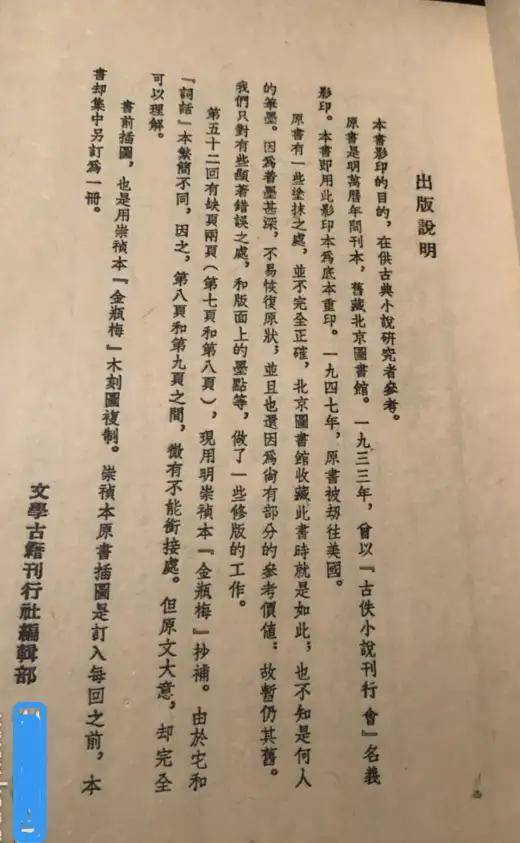 第五十二回有缺叶两叶(第七叶和第八叶),现用明崇祯本《金瓶梅》抄补。由于它和《词话》本繁简不同,因之、第八叶和第九叶之间,微有不能衔接处。但原文大意,却完全可以理解。