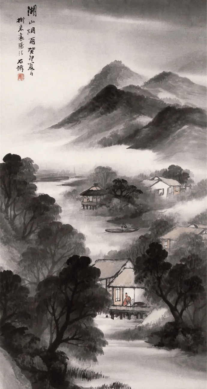 中国近代著名画家吴石仙先的山水画技法,是把水墨层层积墨,或者先把宣纸打湿后再画,以达到水墨淋漓幛犹湿的效果。