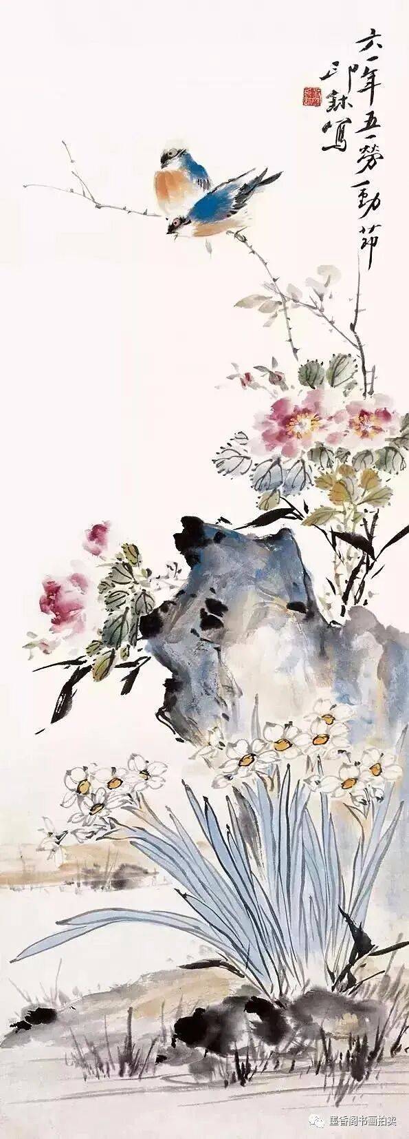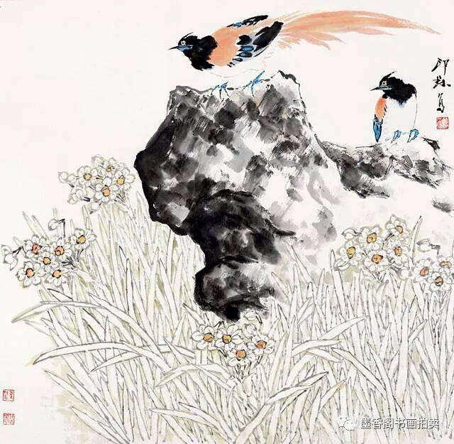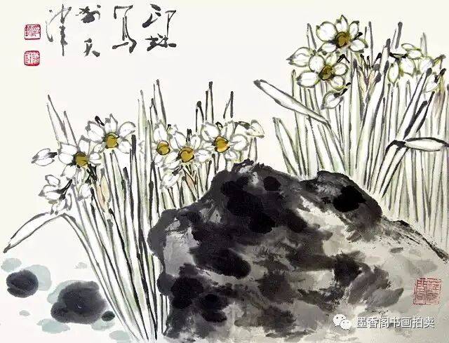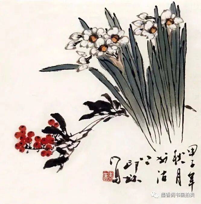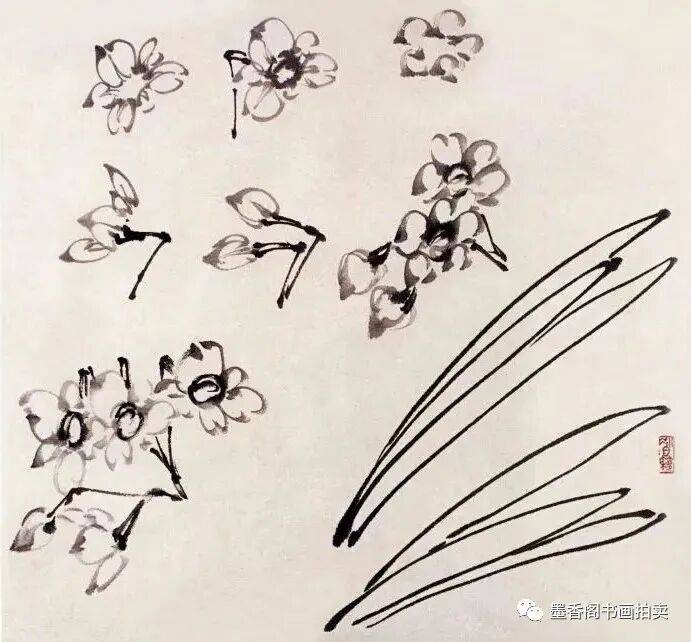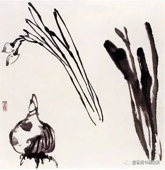 下部球状茎。下生须根,画法也是勾勒。外层有部分干皮,上有纹路,在画中多不画。画初生芽者,水栽只露部分,略勾画露出部分即可,土栽者不画。不论露与不露,叶的下部与球茎连接处均须要虚接。如染色,此处可留白虚染。