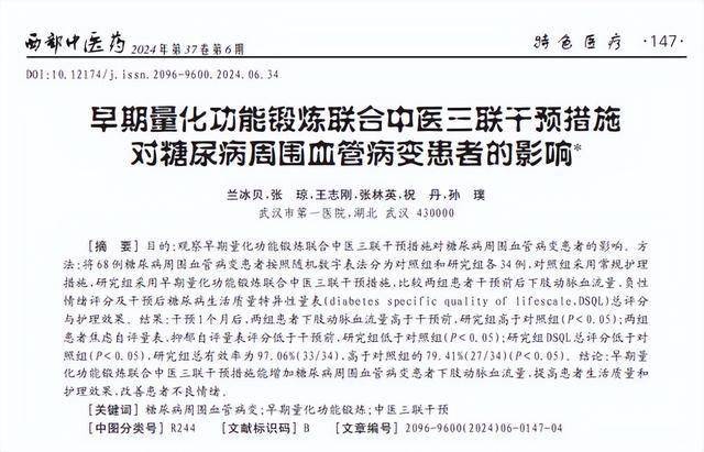兰冰贝,早期量化功能锻炼联合中医三联干预措施 对糖尿病周围血管病变患者的影响,西部中医药,2024-06-15