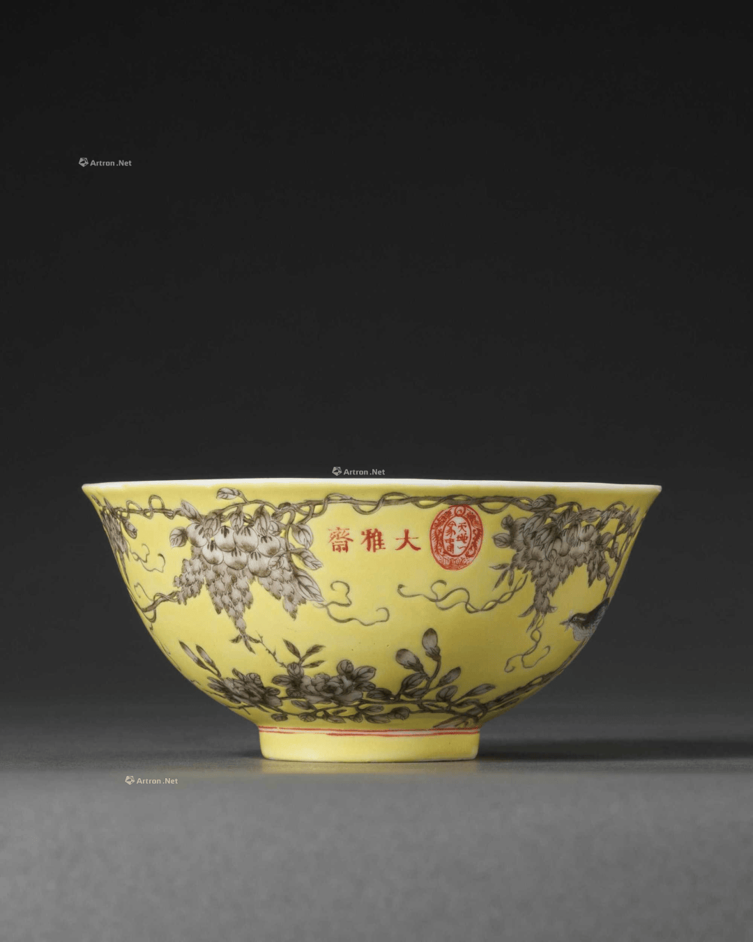 清光绪 大雅斋黄地墨彩葡萄纹盌