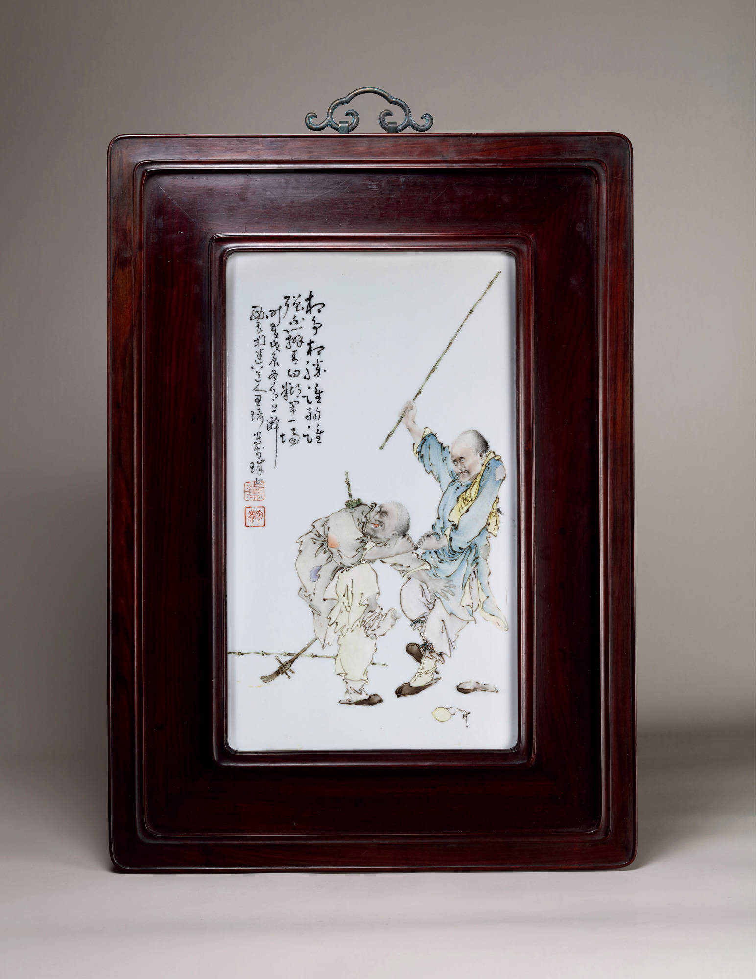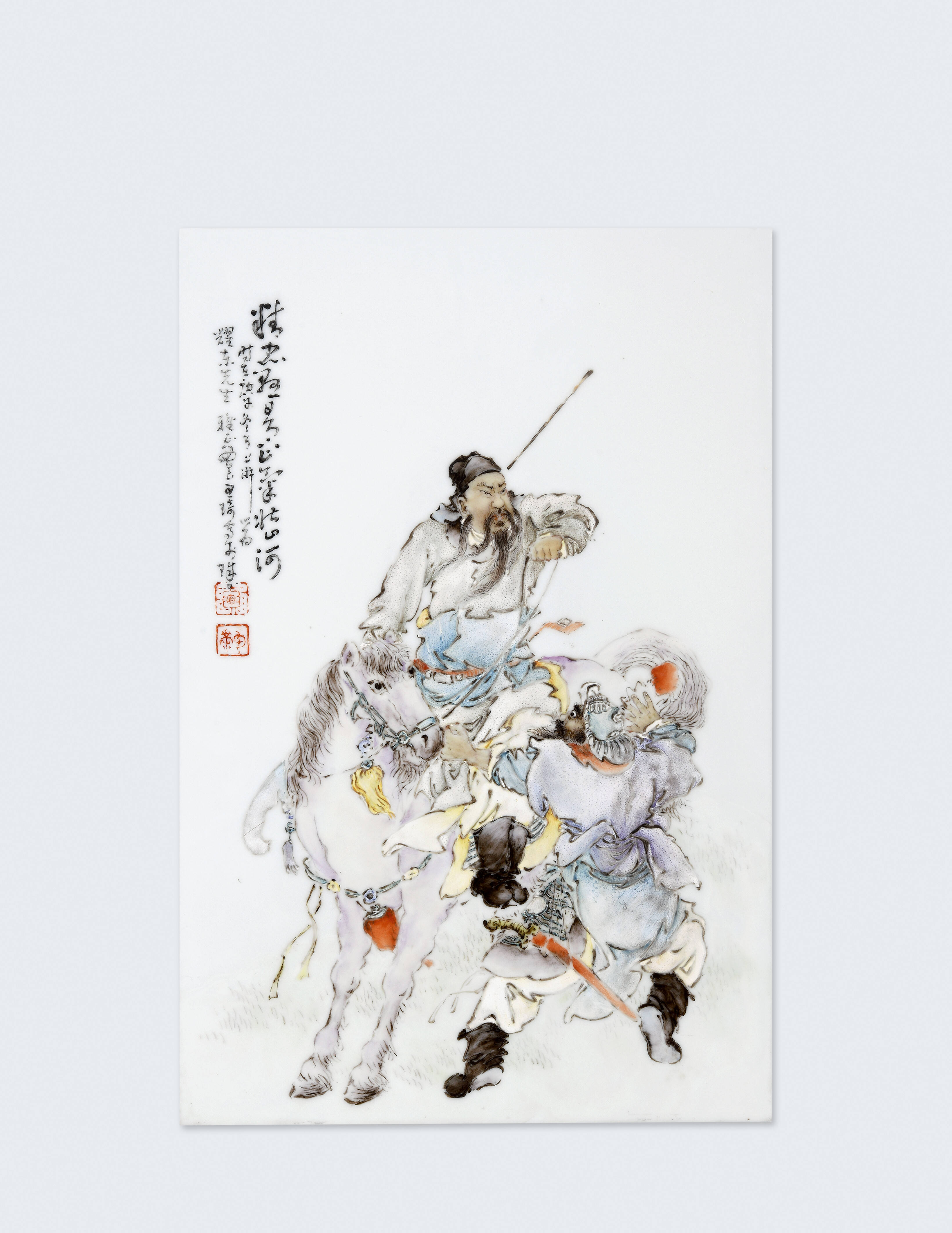 印章也是王琦瓷板画中不可或缺的一部分。他的印章风格多样,或古朴典雅,或灵动飘逸,印文内容多为自己的名号、斋号等。印章在画面中的位置经过精心安排,起到了平衡画面、增添艺术气息的作用。一方小小的印章,朱红的印色与洁白的瓷板、绚丽的画面相互映衬,使整个作品更加精致、完美。在《苏武牧羊图》中,画面右下角的印章 “王琦画印”,印色鲜艳醒目,与画面中苏武坚毅的神情、苍茫的塞外风光形成鲜明对比,却又和谐统一,为画面增添了几分庄重和古朴之感,使作品的艺术价值得到了进一步提升 。