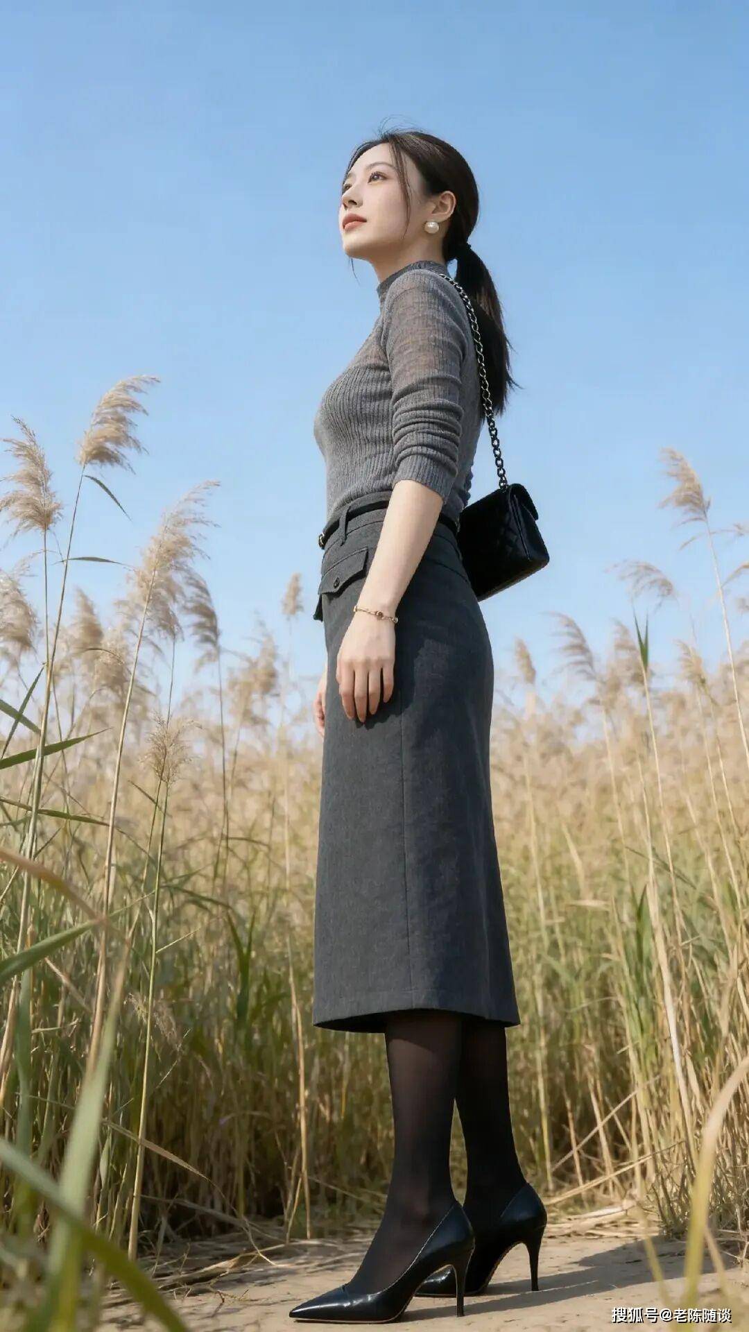第一个动作:侧身45°站立,双手自然搭放。这是最基础也最显身材的动作,避免正对镜头(容易显宽),身体微微侧转45°,重心放在后腿,前腿微微屈膝踮脚,拉长腿部线条。双手不用僵硬下垂,可轻轻搭在腰侧、口袋里,或自然垂在身侧微微弯曲,肩膀放松下沉,头微微侧转看向镜头,嘴角带浅笑,大方又显瘦,还能凸显曲线感。