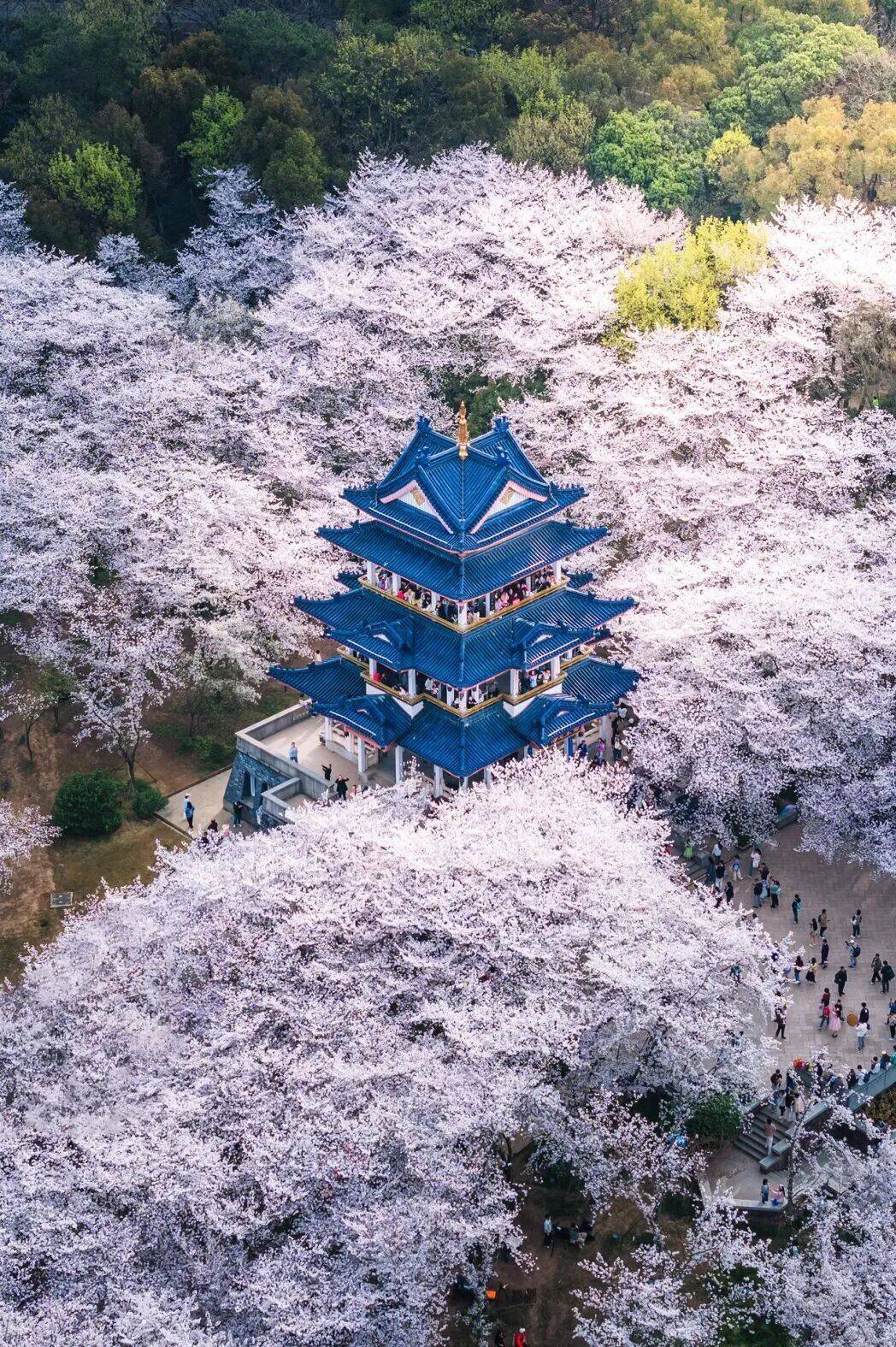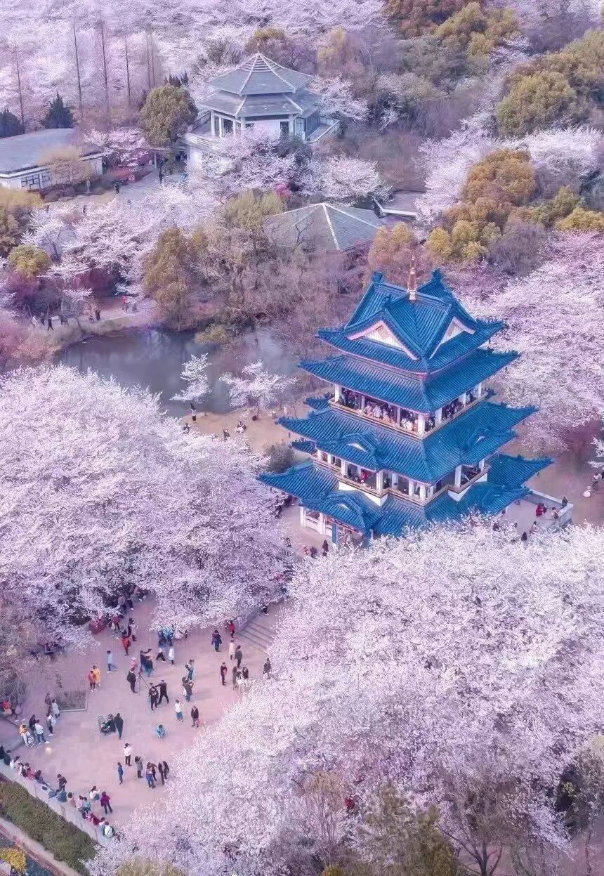 赏樱楼二层:俯拍樱花海和古风建筑。