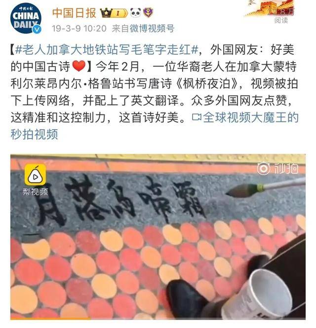 一位中国大叔在蒙特利尔等地铁时,用毛笔蘸水在月台地上书写了这首古诗,引得无数外国友人驻足拍摄,视频传遍海内外网络。许多网友纷纷赞扬大叔的书法,认为其笔法非常优美。还有一些人表示对这么美的作品很感兴趣,但不清楚具体表达的是什么,期望能够有英文版进行解读。于是,不少热心的华人用英文翻译了这首《枫桥夜泊》,还附上了拼音和每个字的意思。