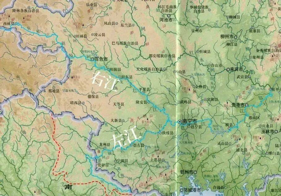 值得一提的是,珠江流域并不独属于我国,西江第一大支流郁江的支流左江上游发源于中国广西宁明县与越南交界处的枯隆山,在越南境内叫作奇穷河,由于有十万大山的阻隔,奇穷河无法直接注入北部湾,反而一路向西侧的陆地行进,途经越南的谅山省政府驻地谅山市,在我国凭祥市重回珠江水系之中。
