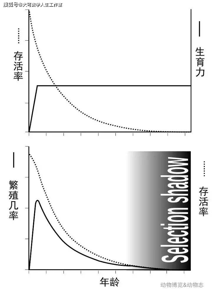 这两种因素结合在一起,就会导致一个结果:生物到了晚年,繁殖的几率会变得非常低,自然选择对这一阶段表达的有害突变,几乎不起作用。梅达瓦尔用“选择阴影”这个概念,来表示自然选择缺席的年龄范围——而这个范围,就是生物体的老年阶段。