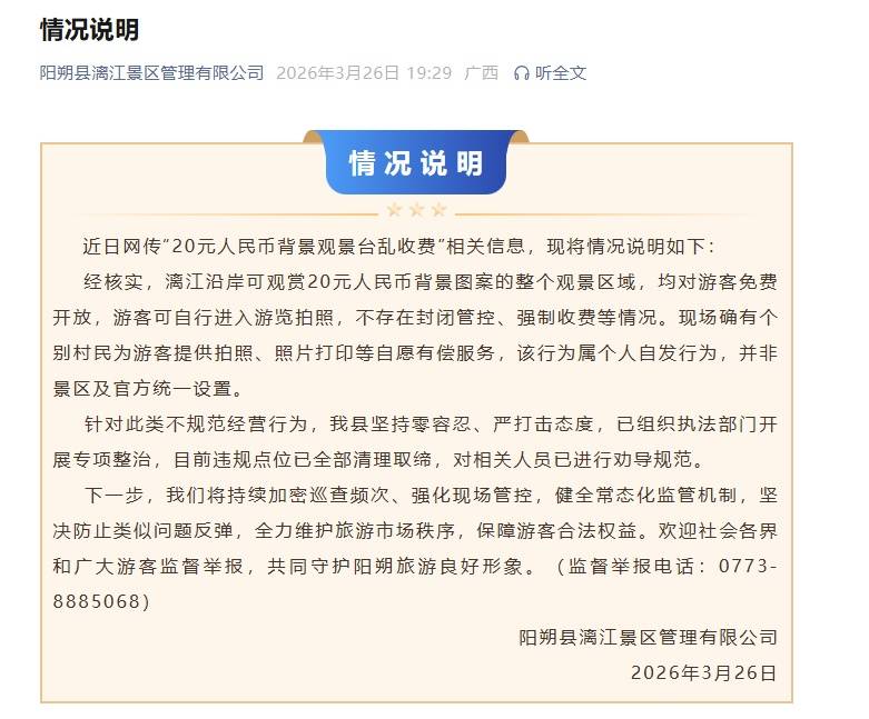经核实,漓江沿岸可观赏20元人民币背景图案的整个观景区域,均对游客免费开放,游客可自行进入游览拍照,不存在封闭管控、强制收费等情况。现场确有个别村民为游客提供拍照、照片打印等自愿有偿服务,该行为属个人自发行为,并非景区及官方统一设置。
