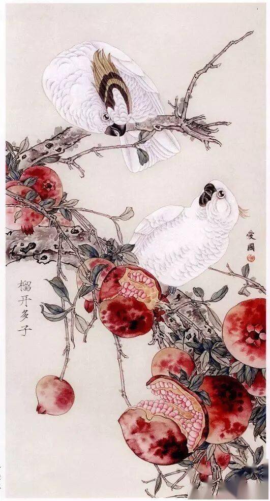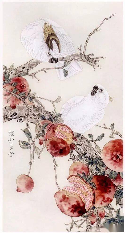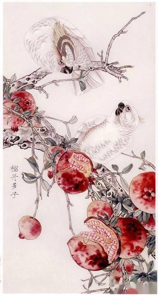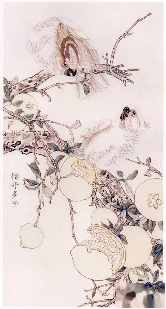 石榴平涂淡粉。鹦鹉平涂白色,冠羽分染浅黄。