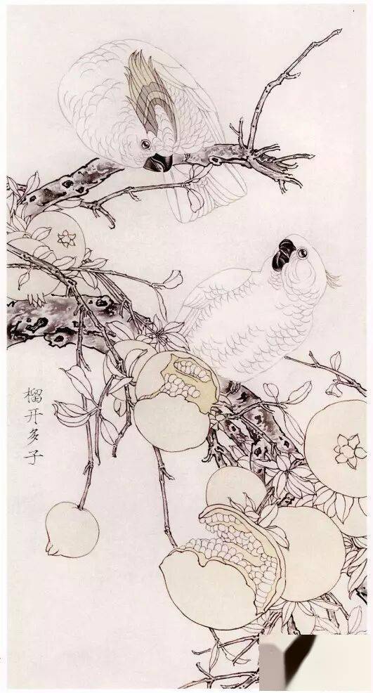 用浓淡墨勾皴出枝干,用重墨勾叶子以及鸟嘴和爪,中墨勾石榴,淡墨勾鸟身、羽毛等部位。